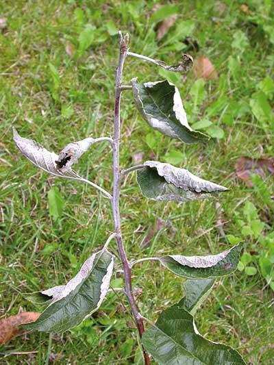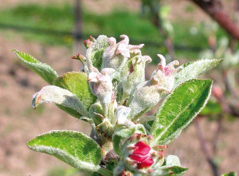 Sprawca mączniaka jabłoni zimuje w postaci strzępek grzybni w pąkach wegetatywnych lub generatywnych, które zostały zakażone w poprzedzającym sezonie. Porażone pędy mają często zahamowany wzrost, a ich wierzchołki przybierają kolor srebrzystoszary. Wiosną, już przed kwitnieniem jabłoni, na liściach bądź kwiatach rozwijających się z zakażonych pąków pojawiają się objawy choroby, pochodzące z infekcji pierwotnych. Porażone liście są zawsze charakterystycznie zwężone, zwijają się, przestają rosnąć i stają się kruche (fot. 1). Kwiaty są również zdeformowane i zasychają nie tworząc owoców (fot. 2). Warto podkreślić, że zarodnikowanie konidialne P. leucotricha rozpoczyna się prawie równocześnie z pojawieniem się objawów infekcji pierwotnych, od samego początku jest obfite oraz prowadzi do licznych infekcji wtórnych.