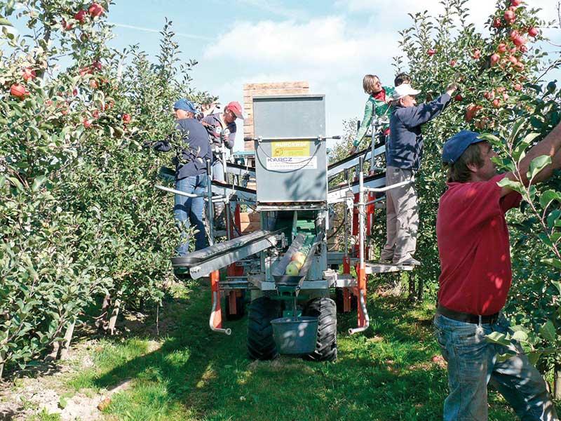 Pluk-O-Trak jest maszyną do zbioru owoców, która została specjalnie zaprojektowana do obsługi nowoczesnych sadów (fot. 1). Niewątpliwą zaletą maszyny jest zbiór owoców z całego drzewa równocześnie, bez konieczności stosowania innego systemu zbioru, co znacznie przyspiesza i usprawnia ten proces oraz wpływa na zmniejszenie wymaganego nakładu pracy. Firma Munckhof (jej przedstawicielem w Polsce jest firma Karcz z Sandomierza) proponuje dwa modele Pluk-O-Traka – Junior i Senior. Pierwszy z nich (Junior) przeznaczony jest do zbioru owoców z drzew o wysokości do 3,5 m i o szerokości międzyrzędzi do 3,5 m. Umożliwia pracę 4 osobom. Senior natomiast jest większą maszyną, przeznaczoną do zbioru jabłek z drzew o wysokości do 4 m i międzyrzędzi o szerokości 4 m. Do obsługi urządzenia potrzeba 8 osób. Całkowita szerokość maszyny wynosi zaledwie 1,3 m. Pluk-O-Trak wyposażony jest w układ przenośników taśmowych (4–6) i obrotową napełniarkę do skrzyniopalet. Osoby pracujące na podestach i na poziomie gruntu układają zerwane owoce bezpośrednio na przenośniki taśmowe, które znajdują się w ich zasięgu. Stąd owoce przenoszone są do napełniarki z opakowaniem zbiorczym. Takie rozwiązanie ogranicza ryzyko uszkodzenia jabłek, dlatego Pluk-O-Trak przeznaczony jest do zbioru owoców kierowanych do długotrwałego przechowywania.