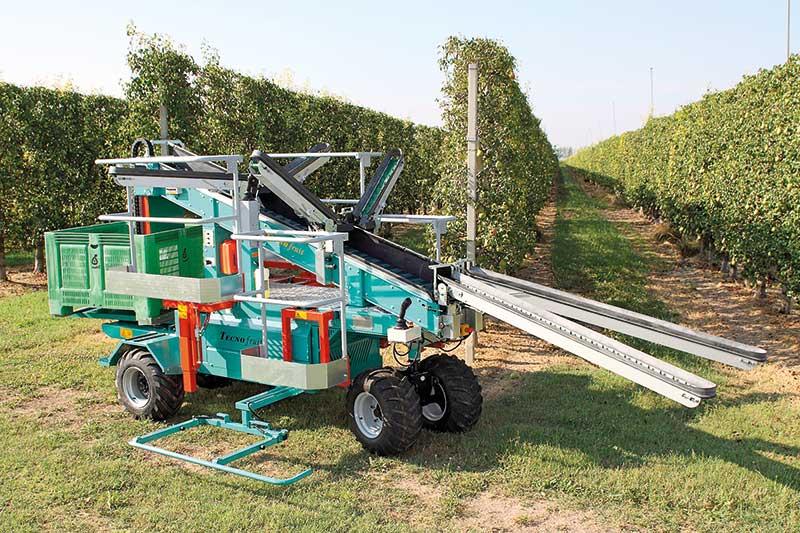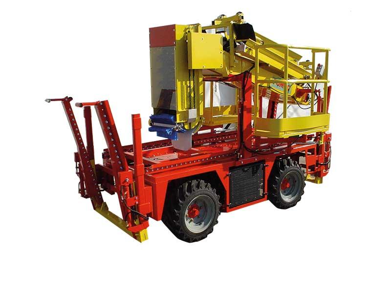 Maszyna firmy ZUCAL (fot. 2). Zastosowano w niej napędzane, skrętne przednie koło. Z kolei na tylnej osi istnieje możliwość zamontowania kół o różnym rozmiarze, co poprawia trakcyjność maszyny i jej stabilność, a także zapewnia bardzo dobrą zwrotność w sadzie. Niezależne hydrauliczne podnoszenie przodu i tyłu maszyny oraz możliwość wychylania całej platformy na boki sprawiają, że maszyną można poruszać się i pracować na skłonach o nachyleniu do 20%, z zachowaniem poziomu platformy roboczej. Wysuw i wysokość balkonów bocznych są regulowane. Przy użyciu tej maszyny podczas zbioru owoców może jednocześnie pracować 6 osób, a każda z nich w ciągu godziny zbiera około 300 kg jabłek. Maszyna jest przystosowana do pracy z przyczepą do transportu pustych skrzyń. Jednostkę napędową stanowi silnik Perkinsa (19 KM) umożliwiający poruszanie się w dwóch zakresach prędkości – do 0,5 km/h i 0,3–5 km/h.