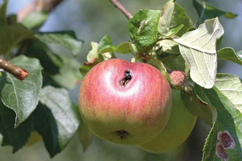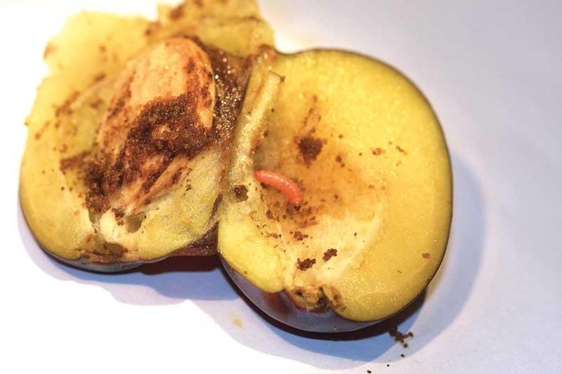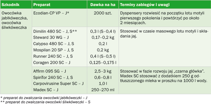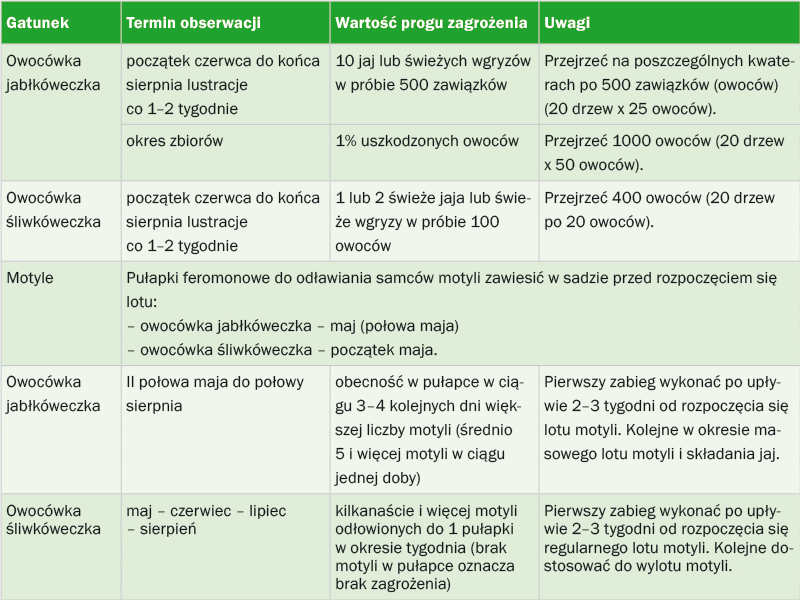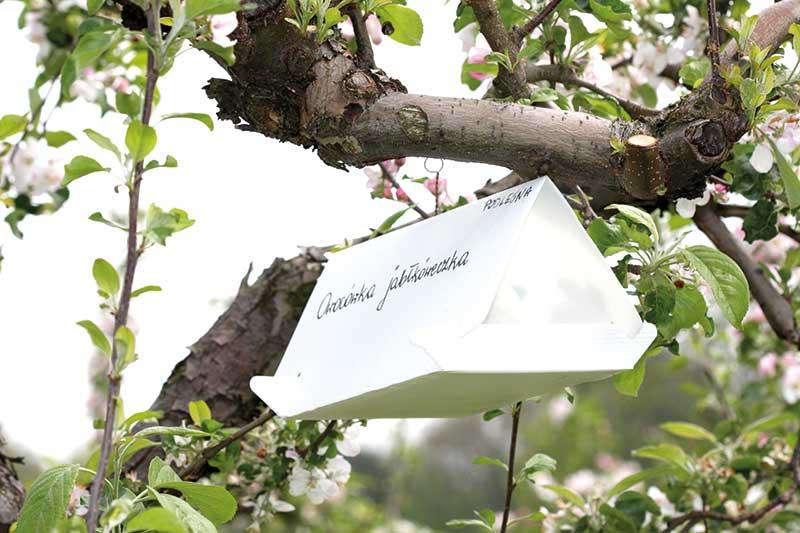 To jeden z najważniejszych szkodników jabłoni, może także atakować grusze. W warunkach naszego kraju szkodnik ten rozwija się w dwóch pokoleniach, najczęściej jednak letnie jest mniej liczne i stanowi około 20–40% w ogólnej liczebności. Jego wielkość zależy w dużym stopniu od warunków termicznych w sezonie, im cieplejsze lato, tym jest ono liczniejsze. Liczebność letniego pokolenia modyfikowana jest również przez zastosowany w danym sadzie program zwalczania pokolenia zimującego, im bardziej skuteczny – tym mniej liczne. Obserwujemy także duże zróżnicowanie w liczebności owocówki jabłkóweczki w poszczególnych sadach. Są takie, w których populacja tego szkodnika jest na tyle niska, że okresowo nie ma potrzeby jej zwalczania. Z kolei w sadach z wysoką liczebnością owocówki mogą być potrzebne 2 lub 3 zabiegi zwalczające (1 lub 2 zabiegi przeciwko pierwszemu pokoleniu i jeden na drugie). Najczęściej pierwsze pokolenie zwalcza się w pierwszej połowie czerwca (w niektóre lata już pod koniec maja) i ponownie w III dekadzie czerwca lub na początku lipca. Drugie pokolenie najczęściej zwalcza się pod koniec lipca lub na początku sierpnia. Dynamika wylotu motyli owocówki jabłkóweczki jest bardzo zróżnicowana, w trakcie jego trwania obserwuje się kilka okresów wzmożonych wylotów. Dlatego też, aby określić optymalny termin dla danego sadu w danym sezonie, konieczne jest śledzenie lotu za pomocą pułapek feromonowych (fot. 1).