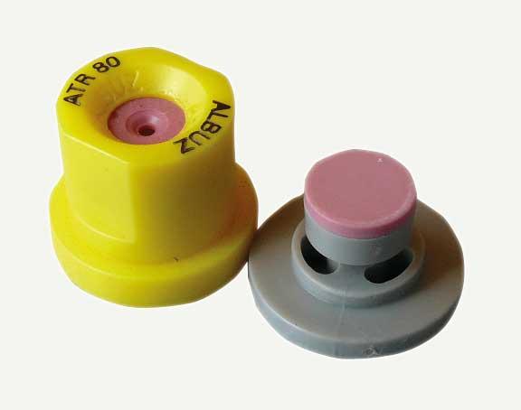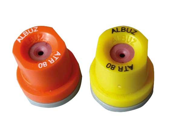 Rozpylacze ceramiczne z różowej ceramiki (do ich produkcji używa się m.in. tlenków aluminium i cyrkonu) marki „Albuz” cechuje wysoka trwałość użytkowania (minimum 10 tys. ha). Ze względu na tę cechę i wolniejsze (w porównaniu z innymi materiałami) zużycie rozpylacze Albuz nie wymagają okresowego kalibrowania. Gwarantuje to utrzymywanie ich parametrów w długim okresie czasu, wykonywanie zabiegów środkami ochrony roślin przy jednakowym zużyciu cieczy roboczej na danym areale i precyzję wykonywania tych zabiegów. Do ochrony upraw sadowniczych firma ta oferuje m.in. rozpylacze wirowe o pustym stożku ATR 80 (80° to kąt strumienia cieczy roboczej), charakteryzujące się drobnymi kroplami. Mogą być używane podczas wykonywania zabiegów zarówno fungicydami, jak i zoocydami. Optymalny zakres ciśnień roboczych dla tego rozpylacza wynosi 5–25 bar.