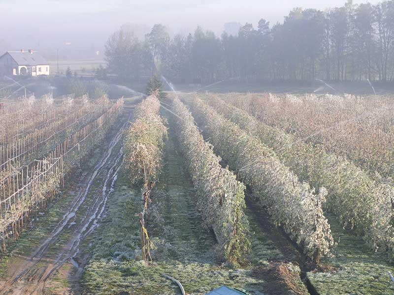 Na etapie planowania instalacji nawodnieniowej w sadzie warto rozważyć możliwość takiej jej konstrukcji, aby móc ją wykorzystać do ochrony antyprzymrozkowej, czyli zamontować zraszacze nadkoronowe. Ich zasięg wynosi zazwyczaj 12 m, dlatego nie muszą być zamontowane w każdym rzędzie (fot. 2 na str. 18). Wydaje się to proste, jednak takie nie jest, gdyż do nawadniania metodą kroplową nie potrzeba tak ogromnych ilości wody jak do ochrony drzew w trakcie przymrozku. I tu często „zaczynają się schody”, bo albo dostęp do wody jest ograniczony albo źródło nie odnawia się na tyle szybko, aby móc na nim polegać w momencie krytycznym. Podczas ochrony antyprzymrozkowej sadu potrzeba zużyć 20–45 m3 wody/godz./ha, ale jej ilość jest wyznaczana przez temperaturę (im niższa, tym dawka wody powinna być wyższa). Jeżeli przymrozek utrzymuje się kilka godzin, wody potrzeba więcej. Ponadto chronić należy zazwyczaj cały sad równocześnie. Ten system jest uważany za najskuteczniejszy i wykorzystuje się go powszechnie w wielu rejonach sadowniczych Europy. Pamiętać należy, że mniejsza niż polecana ilość wody/godz./ha może jednak spowodować więcej szkód niż pożytku (fot. 3).