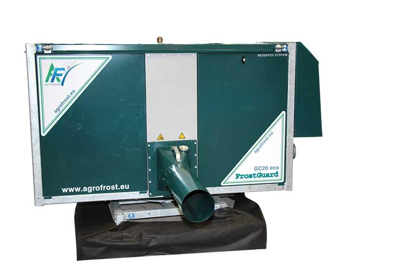 FrostGuard (fot. 4) jest urządzeniem stacjonarnym natomiast FrostBuster zaczepianym do ciągnika. Pierwsze z wymienionych wyposażone jest w prosty palnik gazowy oraz silny wentylator napędzany silnikiem benzynowym. FrostGuard stoi w jednym miejscu w sadzie i podczas pracy obraca się wokół własnej osi, co sprawia, że gorące powietrze umożliwia ochronę roślin w okręgu o promieniu, do którego dociera ciepłe powietrze. Możliwe jest użycie kilku urządzeń. Należy je uruchomić przed wystąpieniem przymrozków i wyregulować temperaturę wydmuchiwanego powietrza. Zapasy benzyny i gazu wystarczają na całonocną pracę urządzenia. Dostępne są dwa modele: TYP GC20 z wydechem dolnym (polecany do sadów) i Typ GC30 z wydechem górnym (zalecany do ochrony upraw jagodowych). Maszyna stacjonarna może ochronić 1 ha uprawy, natomiast na powierzchnię powyżej 3 ha ekonomicznie uzasadniony jest zakup maszyny zaczepianej do ciągnika.