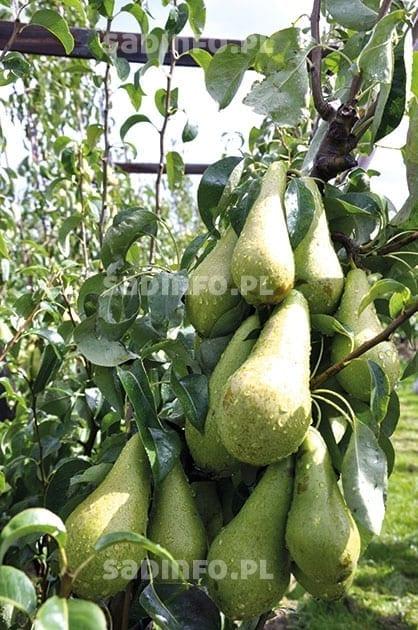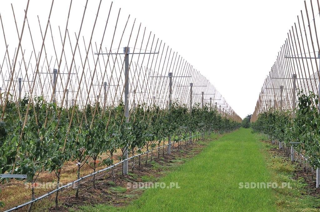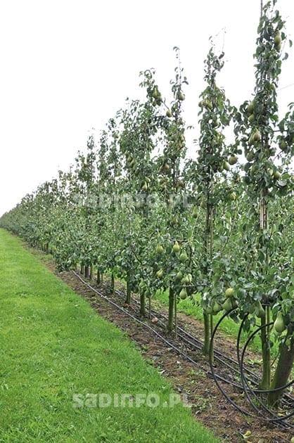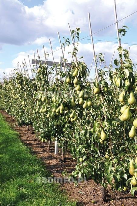 W Holandii i Belgii w uprawie gruszy dominuje ‘Konferencja’ – stanowi 80–90% nasadzeń tego gatunku. Ponadto są też niewielkie nasadzenia ‘Komisówki’ (5%) i ‘Lukasówki’ (5%). W nowych sadach można również spotkać nieduże kwatery odmian Sweet Sensation® i Xenia®. W Holandii wzrasta nie tylko powierzchnia nasadzeń gruszy, lecz także jej wydajność z hektara. W 1997 r. uprawiano ją na 6000 ha, a średni plon wynosił 24 t/ha. W 2014 r. powierzchnia sadów wzrosła do 8700 ha, a średni plon do 40 t/ha. W około 10% gospodarstw zbiory tych owoców przekraczają zazwyczaj 60 t/ha. Aby uzyskać tak dobry efekt, ważne jest właściwe dobranie wszystkich elementów uprawy, począwszy od wyboru materiału nasadzeniowego (powinien być wysokiej jakości) i systemu prowadzenia drzew. Podstawą uzyskania dobrych plonów wysokiej jakości owoców jest systematyczne wycinanie starszych pędów, gdyż są one mniej produktywne. Na młodych pędach pąki są grubsze, a owoce znacznie lepszej jakości. W Holandii grusze najczęściej sadzone są co 1–1,25 m w rzędzie, w ich koronie wyprowadzane są dwa przewodniki, a dolne piętro rozpinane jest w formie tzw. stołu (tabela 1). Drugim dość popularnym systemem prowadzenia gruszy jest system V (fot. 1). W tym przypadku u każdego z drzew wyprowadza się 4 przewodniki, co daje łącznie około 12 tys. przewodników na ha. Przyjmując, że na każdym z nich powinniśmy uzyskać około 5 kg owoców (fot. 2), możemy liczyć na plon około 60 t/ha.