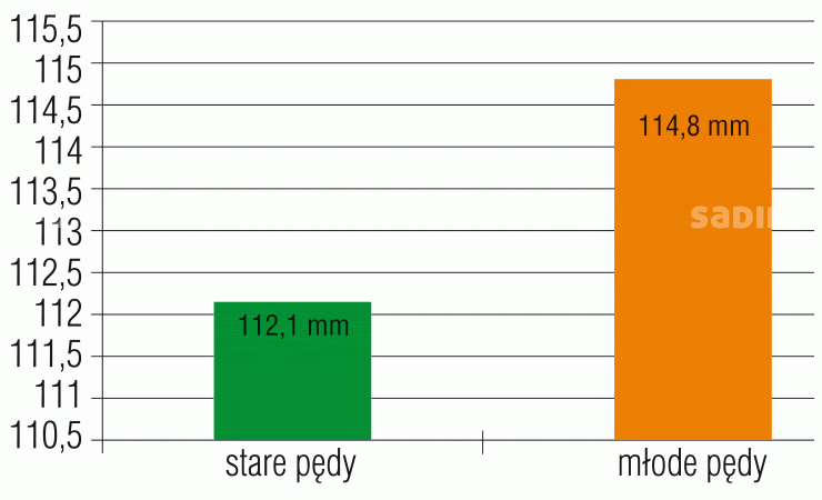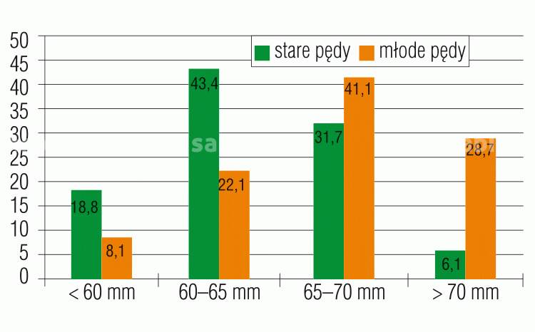Z obserwacji prowadzonych przez J. de Wita wynika, że najlepszej jakości owoce wyrastają na młodych pędach – mają nie tylko większą średnicę (rys. 1), lecz także są dłuższe (rys. 2). W rezultacie mają też większą masę (fot. 4). Na młodych pędach jest o 50% więcej owoców o średnicy powyżej 65 mm niż na pędach starszych, różnica w plonowaniu może więc wynieść około 10 ton/ha (tab. 2).