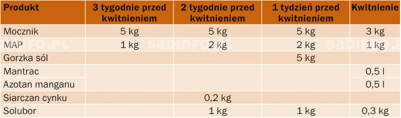 TABELA 3. Program nawożenia gruszy w celu właściwego odżywienia liści (za J. de Witem)