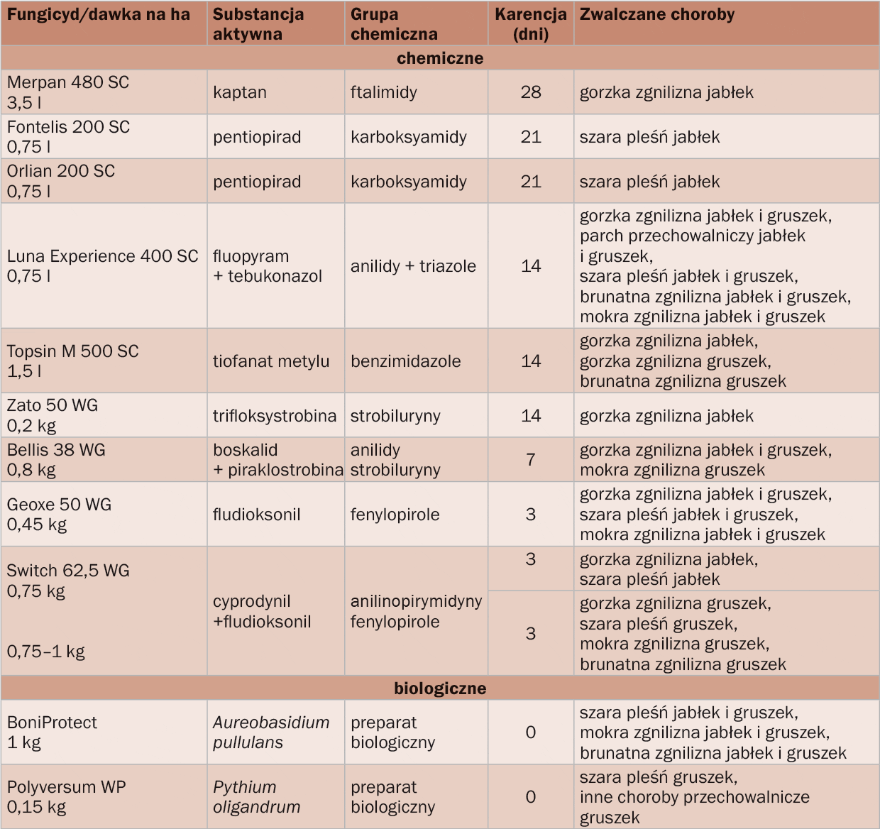 Zestaw preparatów zarejestrowanych do stosowania w okresie przedzbiorczym, jest w tym roku bardzo bogaty i obejmuje 10 środków do ochrony jabłoni i 7 do ochrony gruszy (tabela). Kierując się właściwościami preparatu, spektrum zwalczanych chorób, czy – w końcu – ceną, można wybrać fungicyd odpowiedni do sytuacji w konkretnym sadzie. Celowe jest stosowanie preparatów działających przeciwko kilku chorobom jednocześnie. Daje to oszczędności ekonomiczne, mniejsze skażenie środowiska, a co bardzo ważne dla konsumenta – mniejszą ilość środków chemicznych nanoszonych na owoce. Wymienione preparaty należą do różnych grup chemicznych i zaleca się ich używanie w rotacji, co zapobiega powstawaniu odporności grzybów na fungicydy. Należy szczególnie pamiętać, że grzyby uodporniają się nie tylko na konkretną substancję czynną preparatu, ale na całą grupę chemiczną (np. benzimidazole, strobiluriny), do której ta substancja należy. W tym kontekście trzeba przypomnieć, że kilka substancji aktywnych wchodzących w skład preparatów przedzbiorczych należy do grupy karboksyamidów (SDHI). Są to: boskalid (składnik środka Bellis 38 WG), pentiopirad (składnik środków Fontelis 200 SC i Orlian 200 SC) oraz fluopyram (Luna Experience 400 SC).