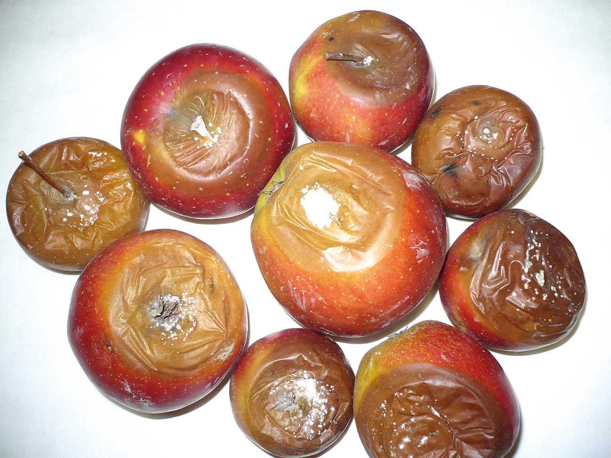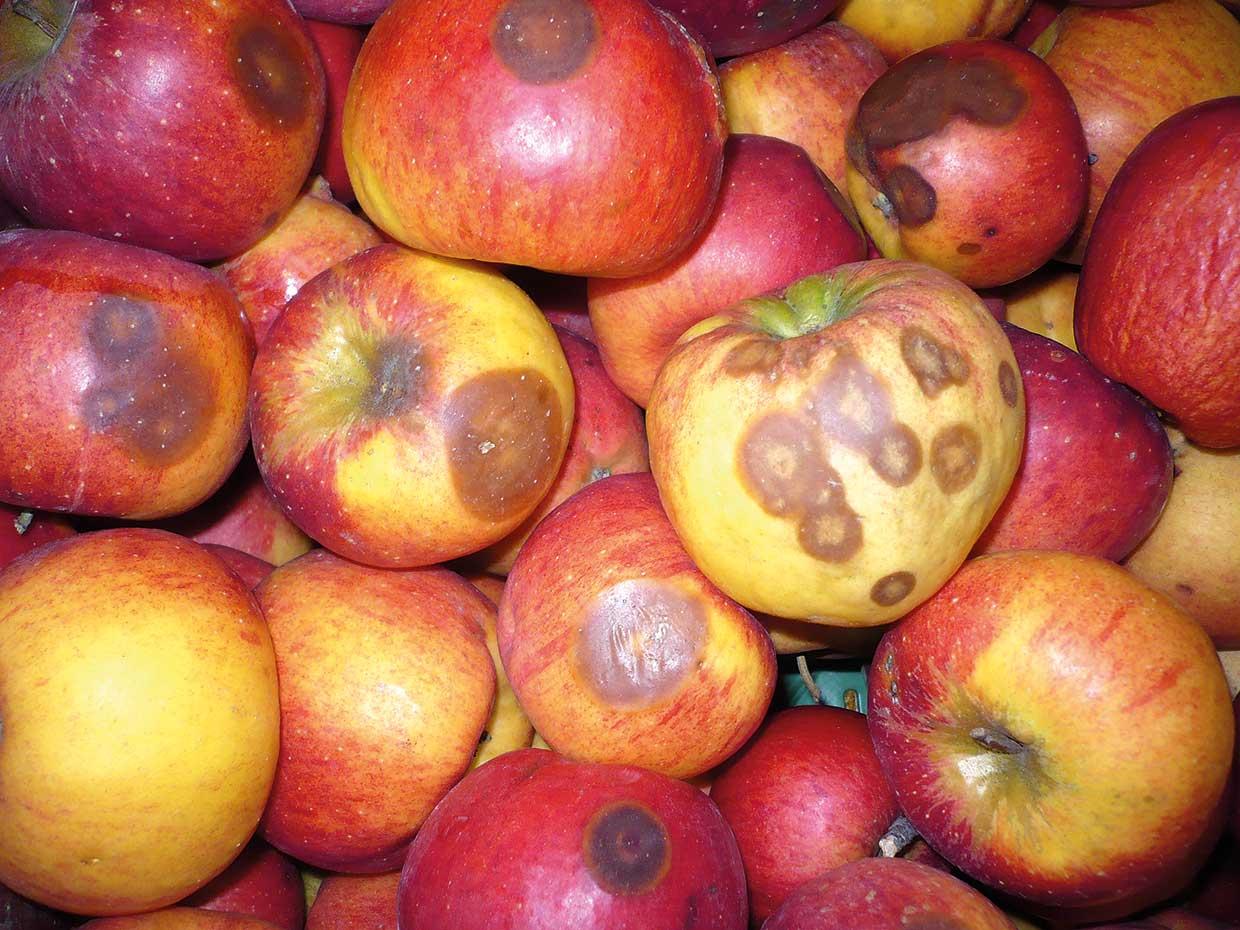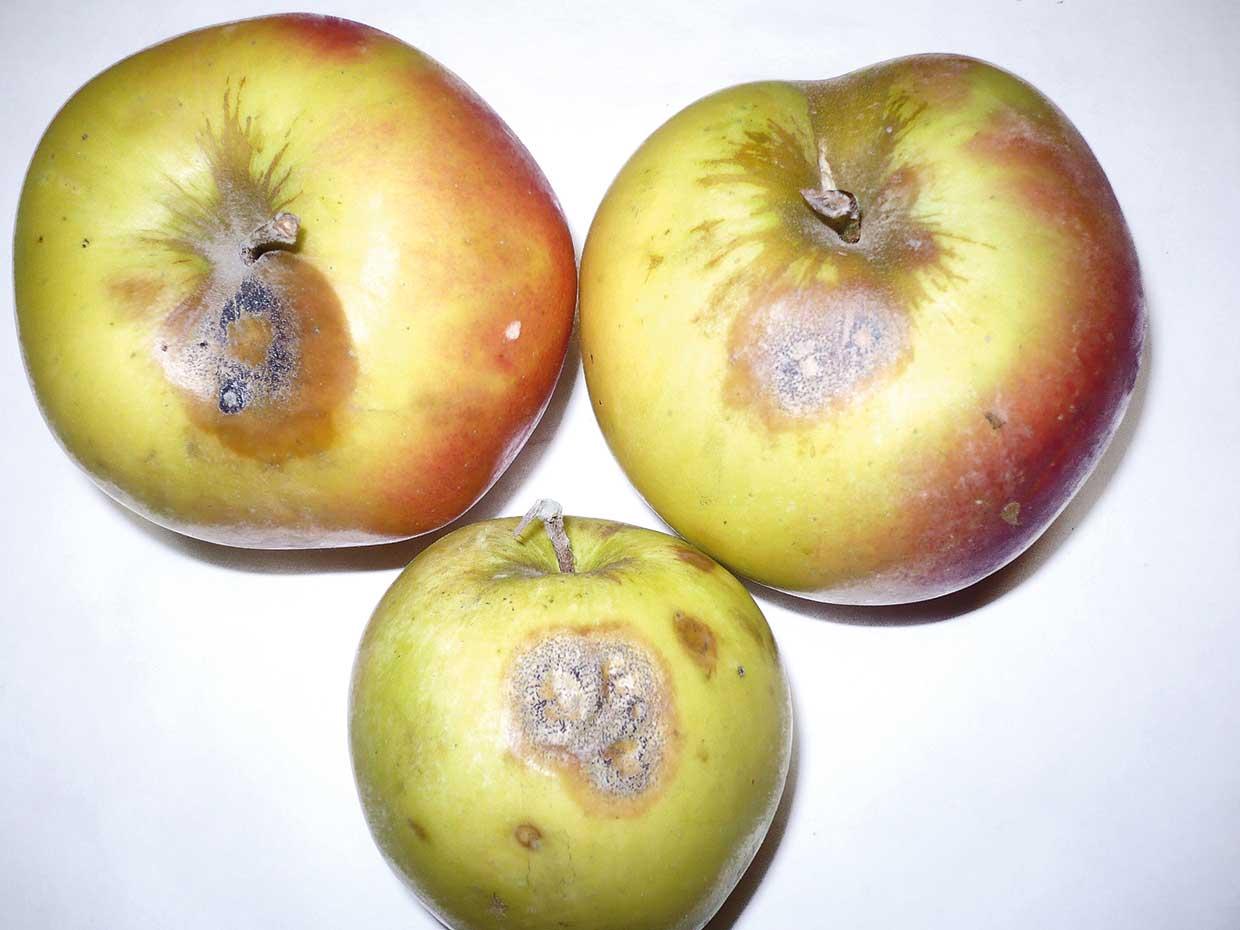 Około sześć tygodni przed zbiorem zaczynamy stosować fungicydy przeciwko najgroźniejszej chorobie – gorzkiej zgniliźnie jabłek i gruszek (fot. 1), a następnie przeciwko szarej pleśni i innym chorobom, które lokalnie mogą stwarzać problemy. Nie należy zapominać także o parchu przechowalniczym. Wprawdzie intensywna walka z parchem jabłoni już za nami, jednak nadal trzeba prowadzić lustracje sadu i w miarę potrzeby interweniować. Nawet niewielkie źródło zakażenia, w postaci „żywych” (zarodnikujących) plam na liściach, może być przyczyną porażenia owoców przy deszczowej pogodzie. Efektem mogą być plamy parcha późnego, rozwijające się jeszcze przed zbiorem jabłek, lub parcha przechowalniczego, które pojawią się dopiero podczas przechowywania. Z uwagi na to zagrożenie, ochrona sadów powinna być kontynuowana przy użyciu preparatów kontaktowych, aż do zbioru owoców. Intensywność ochrony przed gorzką zgnilizną zależy od trzech czynników: obecności źródła choroby w sadzie, podatności odmiany jabłoni lub gruszy i warunków atmosferycznych. Im bardziej podatna odmiana i więcej deszczu w okresie przedzbiorczym, tym więcej zabiegów należy wykonać.