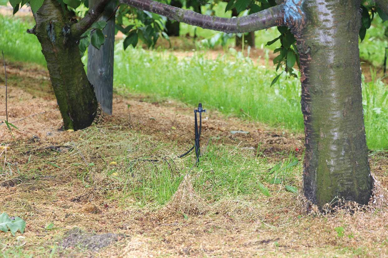 Jak informował prof. dr hab. W. Treder, w sadzie czereśniowym sprawdzają się dwa rodzaje nawadniania: kroplowe oraz przez minizraszacze podkoronowe (fot. 2). Instalacja z tymi ostatnimi (dobrze jest w niej uwzględnić kompensację ciśnienia) zapewnia nawadnianie gleby na określonym obszarze pod koronami, co jest ważne w przypadku czereśni, które mają szeroki system korzeniowy. Istnieje jednak ryzyko uszkodzenia zraszaczy przez pracowników podczas zbioru owoców i rozwoju chorób kory oraz drewna na pniach znajdujących się w zasięgu zraszania.