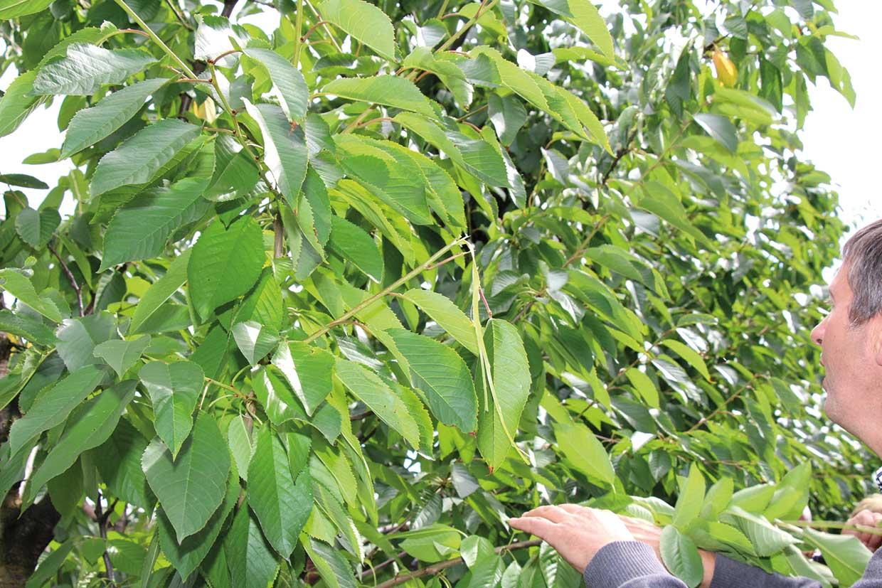 Podczas części praktycznej w sadzie, B. Liesenborghs przedstawił zasady cięcia samo- i obcopylnych odmian czereśni. Niepotrzebne pędy można wycinać sekatorem (zdrewniałe) lub ręcznie je wyłamywać, gdy są niezdrewniałe (fot. 5). Według doradcy, rany po wyłamaniu pędów goją się szybko i nie ma ryzyka zakażenia ich patogenami wywołującymi choroby kory i drewna.