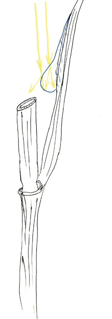 Rysunek 2. Kropla cieczy roboczej na liściu rośliny dwuliściennej[/caption]Środkom wykorzystywanym w ochronie roślin rolniczych stawiane są inne wymagania, nawet w stosunku do właściwości fizycznych sporządzanych z nich cieczy roboczych. Produkt używany przykładowo do ochrony zbóż, czyli roślin jednoliściennych o specyficznej budowie (wzniesionych, wąskich liściach ułożonych prostopadle lub pod dość ostrym kątem w stosunku do podłoża), musi zostać tak skomponowany, aby roztwór jak najdłużej utrzymał się na roślinie i nie spływał z niej po aplikacji (rysunek 1). Zupełnie inaczej jest w przypadku ochrony roślin dwuliściennych – do których należy przeważająca większość gatunków użytkowanych w ogrodnictwie. W tym przypadku liście przeważnie ułożone są równolegle do podłoża, więc roztwór musi być: fotostabilny, wolno wysychający oraz łatwo rozpływający się po powierzchni (rys. 2).