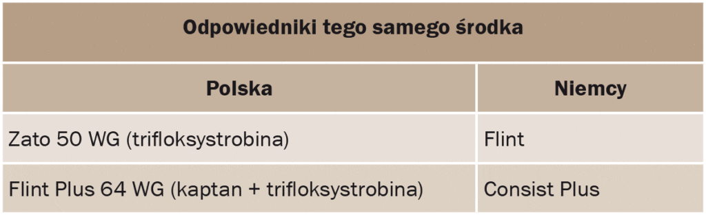 Środki ochrony roślin w zależności od kraju, w którym są zarejestrowane mogą mieć zupełnie inne lub/i bardzo podobne nazwy. Zarejestrowany w Niemczech środek Flint, nie jest odpowiednikiem zarejestrowanego w Polsce fungicydu Flint Plus 64 WG (mimo podobnej nazwy). Niemiecki środek różni się od polskiego przede wszystkim zawartością i rodzajem substancji czynnej.[/su_note]