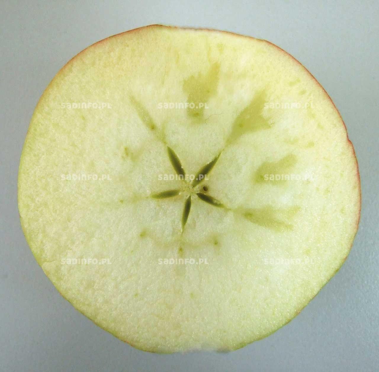 Warunki wegetacji w sezonie 2015 nie sprzyjały kształtowaniu wysokiej jakości owoców. Podczas zbioru stwierdzaliśmy w nich szklistość miąższu. To choroba fizjologiczna, na której powstanie sadownik praktycznie nie ma wpływu, a jedynie musi z rozsądkiem podejść do ograniczenia ewentualnych strat. W przypadku wystąpienia niewielkich zmian (fot. 1) z reguły wystarcza opóźnienie schładzania owoców po zbiorze i szkliste miejsca ulegną wchłonięciu. Oczywiście obniżamy w ten sposób potencjalną trwałość przechowalniczą jabłek, ale ratujemy się przed szybkim wystąpieniem rozpadów po szklistości. Jeżeli jednak zmiany są bardzo rozległe (fot. 2), to takie owoce nie powinny w ogóle trafić do obiektu przechowalniczego. Umieszczenie ich w chłodni spowoduje bardzo szybki rozwój wspomnianych rozpadów. Tym bardziej zastosowanie pozbiorczego traktowania owoców 1-metylocyklopropenem (1-MCP) i/lub technologii niskotlenowych zahamuje wchłanianie szklistych miejsc. Do niedawna uważano, że podatne na nią są przede wszystkim ‘Gloster’, ‘Elise’ czy ‘Fuji’. W ostatnich sezonach objawy tej choroby można jednak spotkać praktycznie na większości odmian, w tym szczególnie na letnich.