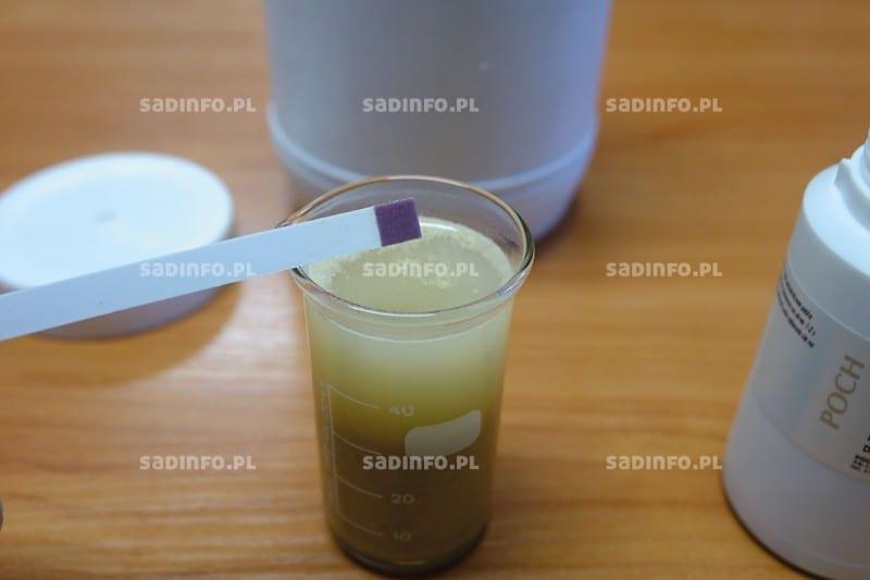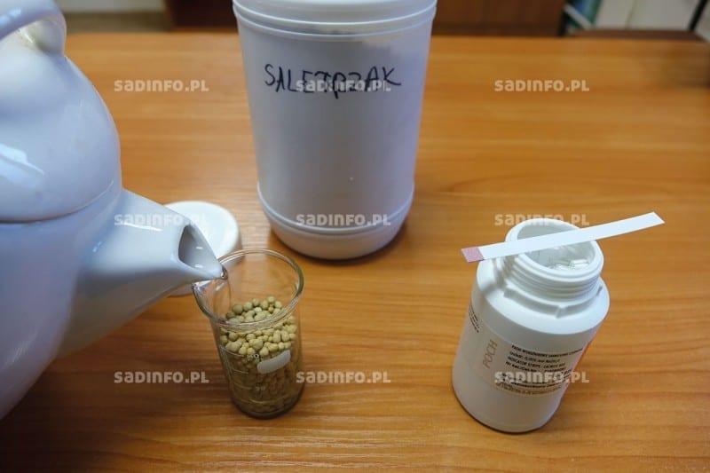 Dużym błędem jest również wysiewanie saletrzaków w sadach prowadzonych systemem uniemożliwiającym ich wymieszanie z glebą. Z chemicznego punktu widzenia saletrzak jest azotanem amonu (saletrą amonową) z dodatkiem węglanu wapnia (saletrzak zwykły) lub węglanu wapnia i węglanu magnezu (Salmag). Węglany wapnia i magnezu pełnią rolę wypełniacza, a zarazem stabilizatora granuli nawozu. Proces rozkładu granul saletrzaku pod wpływem wilgoci i temperatury łatwo sprawdzić w warunkach domowych: wystarczy do jakiegoś pojemnika wsypać niewielką ilość nawozu i zalać go ciepłą wodą (fot. 3). Po kilku chwilach od zamieszaniu nawozu nad pojemnikiem można wyczuć drażniący zapach amoniaku – gazu powstającego w wyniku rozkładu azotu amonowego w środowisku alkalicznym (fot. 4).