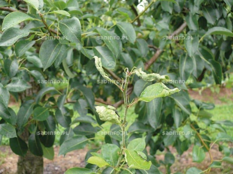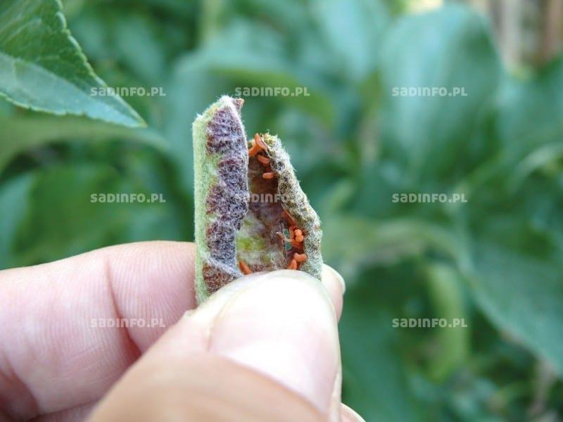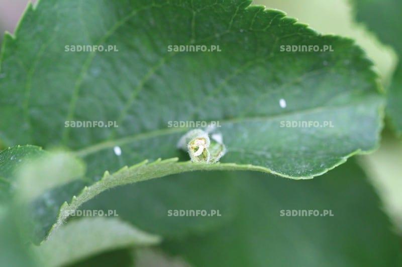 Wylęgające się beznogie larwy są początkowo kremowe, a pod koniec rozwoju różowawe. Ich długość nie przekracza 3 mm. Żerując powodują silne zwijanie się liści (równolegle do nerwu głównego, fot. 1), a w końcu ich czernienie oraz zasychanie. Na jednym liściu może się znajdować kilkanaście, a czasami nawet dwadzieścia larw. Zniszczenie liści wierzchołkowych powoduje zahamowanie wzrostu pędów (na drzewkach w szkółkach także przewodnika). Po zakończeniu rozwoju na liściach, który trwa około 3 tygodni, larwy wypadają do podłoża sadu i wdrążają się w glebę na głębokość kilku centymetrów. Tam sporządzają kokony, w których się przepoczwarczają. Po około dwóch tygodniach następuje wylot kolejnego pokolenia osobników dorosłych. Może on być jednak opóźniony, jeżeli przez długi czas nie było deszczu (sucha gleba utrudnia wydostawanie się muchówek na powierzchnię). Jeżeli sytuacja taka utrzymuje się przez dłuższy czas, to może powodować istotne ograniczenie liczebności populacji. W sprzyjających warunkach liczebność szkodnika z każdym pokoleniem może się zwiększać. W ciągu minionej dekady rejestrowano niestety wyraźny wzrost zagrożenia ze strony tego gatunku. Ze względu na sposób żerowania (w silnie zwiniętych brzegach liści) zwalczanie tego szkodnika nie jest łatwe. W takie miejsca mogą dotrzeć jedynie preparaty systemiczne (np. Movento 100 SC, Mospilan 20 SP). W przypadku niezbyt licznego wystąpienia objawów żerowania tego szkodnika, jego liczebność można redukować mechanicznie wycinając pędy z charakterystycznie zwiniętymi liśćmi. Jest to możliwe na nieco starszych drzewach i jest zalecane jako jeden z elementów ochrony integrowanej.