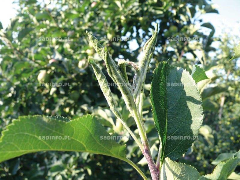 Pryszczarek jabłoniak (Dasyneura mali) to szkodnik, którego liczne występowanie na jabłoniach jest rejestrowane już od dłuższego czasu. Owady dorosłe tego gatunku są nieco większe niż pryszczarka gruszowca (do 2,5 mm długości). Samice składają jaja tuż przy krawędzi młodych liści, a po 3–5 dniach wylęgają się z nich larwy, których żerowanie powoduje bardzo silne zwijanie się liści równolegle do nerwu głównego. Kolejne zwoje tak silnie do siebie przylegają, że trudno je rozwinąć bez uszkodzenia liścia. W ostatnim, najbardziej ściśniętym zwoju znajduje się prawie zawsze kilka lub kilkanaście beznogich maleńkich, kremowych lub różowawych larw (fot. 2). Wszystkie fazy rozwoju, jak i czas, w jakim to następuje są bardzo podobne do opisanych w odniesieniu do pryszczarka gruszowca – są to bowiem gatunki bardzo blisko spokrewnione. Na drzewach starszych (5 lat i więcej) szkodnik ten nie ma wpływu na wielkość ani na jakość plonu. Oczywiście, widok licznych zasiedlonych przez niego pędów (fot. 3) nie sprawia dobrego wrażenia estetycznego, ale nie zagraża żadnymi stratami. Nie można go natomiast lekceważyć w szkółkach i młodych sadach, w których może wpływać na zahamowanie wzrostu nielicznych pędów albo utrudniać odpowiednie kształtowanie koron. W sezonie wegetacyjnym z reguły występują trzy pokolenia tego szkodnika i każde z nich może być liczniejsze od poprzedniego. Nie jest jednak wykluczone czy wraz ze zmieniającymi się warunkami klimatycznymi nie występuje przynajmniej częściowe czwarte pokolenie.