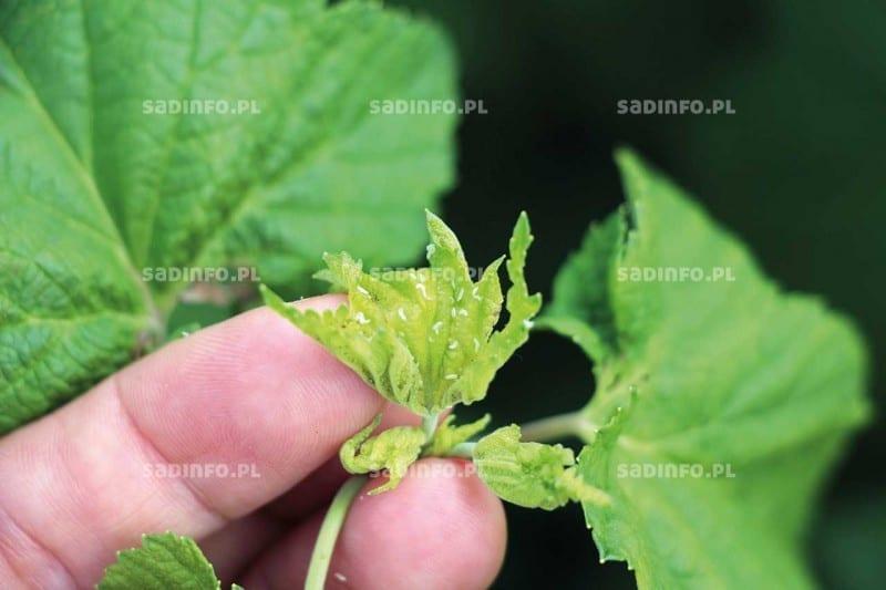 Pryszczarek porzeczkowiak liściowy (Dasyneura tetensi) zasiedla liście (głównie wierzchołkowe, fot. 4) czarnych porzeczek, a ślina wprowadzana przez larwy podczas żerowania powoduje zwijanie i skręcanie się liści, a w miarę upływu czasu ich przebarwianie i zasychanie. Może to także prowadzić do zamierania wierzchołków wzrostu, co osłabia wzrost krzewów i może skutkować zmniejszeniem plonowania. W sezonie szkodnik może mieć trzy pokolenia. W przypadkach koniecznych, po ustaleniu przekroczenia progu zagrożenia, obydwa te szkodniki zwalcza się pierwszy raz w sezonie tuż po kwitnieniu, a drugi (jeżeli nadal jest to konieczne) po zbiorze owoców. Niestety, do redukcji liczebności tych gatunków zarejestrowany jest tylko jeden preparat – Calypso 480 SC w dawce 0,2 l/ha.