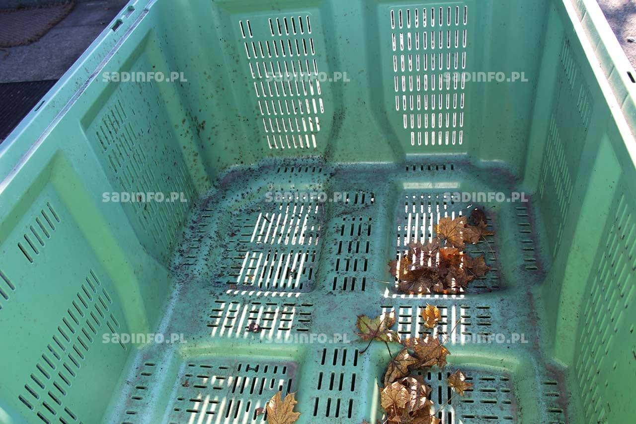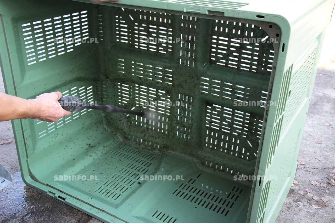 W przypadku skrzyniopalet z tworzywa sztucznego (o ażurowych, litych bądź szczelinowych ścianach i podłodze, w tym typu Big-Box) mycie może być koniecznością, z uwagi na łatwość przylegania zanieczyszczeń do powierzchni skrzyń (wosk z jabłek, kurz, suche liście, fot. 2). Tu również można użyć myjki ciśnieniowej (fot. 3), a nawet detergentu np. wykorzystywanego w gospodarstwie domowym (dopuszczonego do styczności urządzeń mytych z żywnością) czy przemyśle spożywczym. Następnie należy spłukać pojemnik wodą. Do mycia (w układzie zamkniętym) pojemników z tworzyw sztucznych wykorzystać można preparaty np. z serii Polana – K100 lub 914, natomiast w układzie otwartym te z serii o symbolach: A20 chloral (mycie pianowe z dezynfekcją), A10p czy K100p (mycie pianowe). Do ręcznego lub mechanicznego mycia i odtłuszczania użyć można produktu Polana N50. W przemyśle spożywczym, w myjkach automatycznych wykorzystywany może być również m.in. Prosan A.