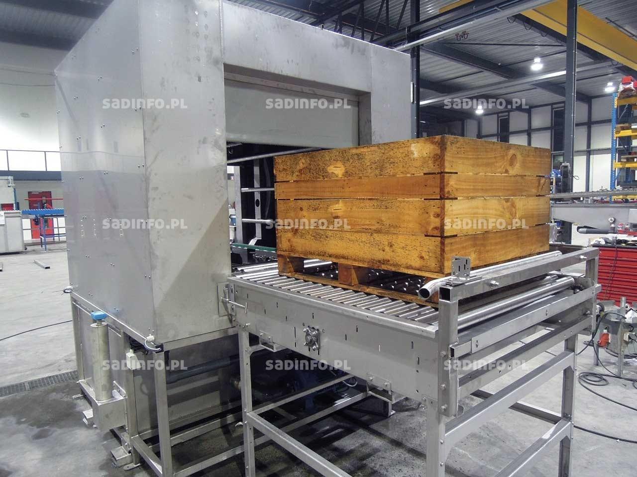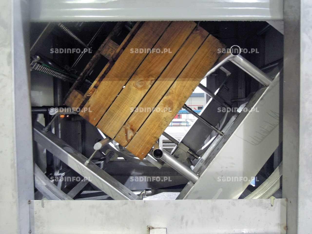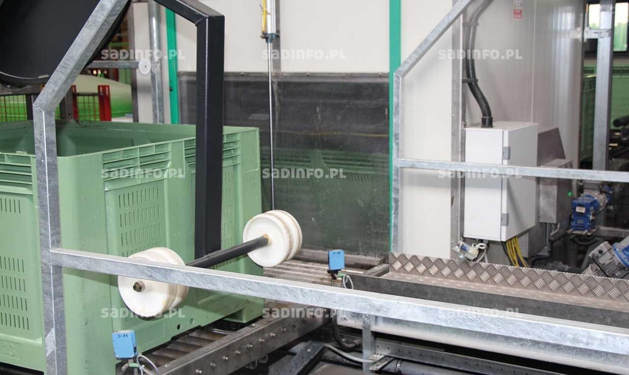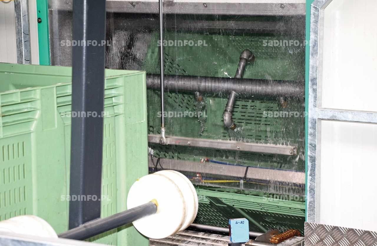 Ręczne mycie skrzyniopalet nie zawsze jest w pełni skuteczne, nawet za pomocą lanc wysokociśnieniowych trudno bowiem czasami usunąć zabrudzenia. Czasowe odmoknięcie pojemnika (tj. zanurzenie w aktywnej cieczy) i następcze mycie bywa dużo bardziej efektywne. Na rynku dostępne są takie specjalne urządzenia do mycia skrzyniopalet, np. myjka do skrzyniopalet firmy BURG (fot. 4). Maszyna ta składa się z automatycznego podajnika brudnych skrzyń, komory myjącej wyposażonej w spryskiwacze myjące skrzynię z zewnątrz, głowicę myjącą wnętrze skrzyni oraz mechanizmu obracającego ją o 180°. Komora myjąca na wejściu i wyjściu skrzyń ma wodoodporne, automatycznie opuszczane i podnoszone ekrany. Za komorą myjącą znajduje się platforma, z której odbierane są czyste skrzynie. Jest ona wyposażona w chwytak piętrujący umyte pojemniki, tak aby nie trzeba było za każdym razem odbierać pojedynczej umytej skrzyni. Omawiana maszyna może pracować niezależnie lub być skonfigurowana z linią sortowniczą, tak aby skrzynie bezpośrednio po rozładunku owoców trafiały do czyszczenia, bez konieczności przewożenia ich wózkiem widłowym. Automat rozładunku wodnego podaje wtedy skrzynie na podajnik maszyny myjącej, a ta automatycznie rozpoczyna proces mycia.