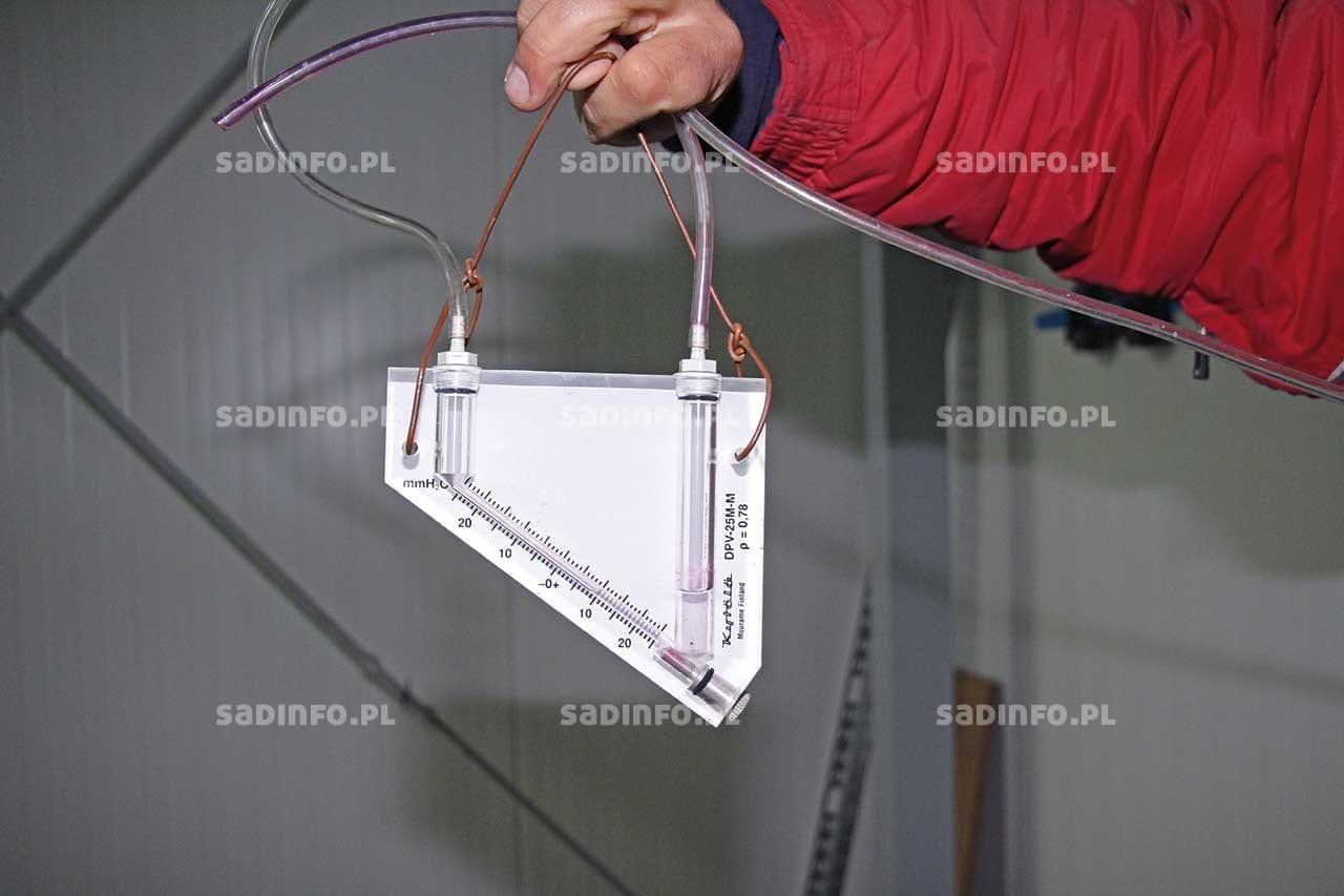 Samodzielnie można sprawdzić szczelność komór i ewentualnie zlikwidować nieszczelności. Nadaje się do tego celu np. poliuretanowy, elastyczny klej przeznaczony do uszczelniania i wykonywania spoin odpornych na wibracje i dylatacji poziomych w posadzkach przemysłowych. Po poprawie uszczelnienia (oznaczonych miejsc) ponownie należy wykonać test szczelności. Można zlecić przeprowadzenie go firmie specjalizującej się w uszczelnianiu komór chłodniczych lub wykonać go samodzielnie przy użyciu specjalnego urządzenia (fot. 6) lub rurki wygiętej w kształcie litery U i napełnionej wodą, której jeden z końców musi znajdować się we wnętrzu badanej komory. Woda w rurce umożliwia śledzenie zmian ciśnienia w obrębie zamkniętej komory poprzez przesunięcie się poziomu płynu (w stosunku do podziałki na niej lub przymocowanej do niej linijki). Z komory poddanej badaniu wcześniej należało wypompować część powietrza np. odkurzaczem przez zawór w drzwiach, aby powstało podciśnienie. Jeżeli słupek wody przesunie się nieznacznie, oznacza, to, że komora jest szczelna i bez obaw można w niej składować owoce lub warzywa. Jeżeli przesunie się znacznie, to należy zlokalizować i zlikwidować nieszczelność.