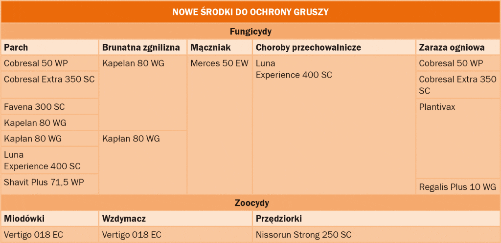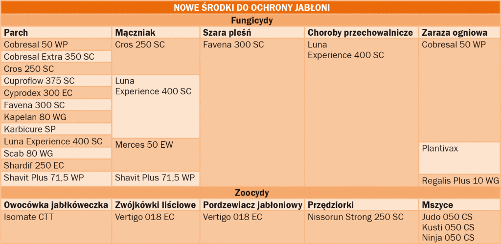 W bieżącym sezonie ochrony roślin sadowniczych przed agrofagami znajdzie się wiele nowości w porównaniu z programem z 2015 r. Pozwolą one na racjonalną walkę ze szkodnikami, sprawcami chorób drzew i krzewów owocowych oraz chwastami, a przede wszystkim na przemienne stosowanie różnych substancji czynnych, aby zapobiec uodpornieniu się agrofagów. Poniżej podaję wszystkie nowe środki (i ich skład chemiczny), grupując je w tabelach (uwzględniając tylko drzewa owocowe; tabele dotyczące owoców jagodowych zostały opublikowane w miesięczniku „Truskawka, Malina, Jagody”, a całość zbiorczą na portalu ogrodinfo.pl), w zależności od wykorzystania.