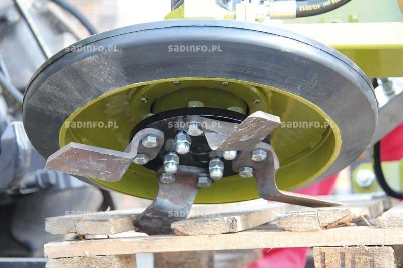 Jedną z firm oferujących maszyny sadownicze jest Urmik, dystrybutor urządzeń czeskiej marki Ostraticky, specjalizującej się w ich produkcji od ponad 20 lat. W ofercie firmy znajdują się m.in. urządzenia do podcinania korzeni, przycinania pędów, glebogryzarki i kosiarki, a także bierne i aktywne pielniki. Jak podkreślał Adam Wolski (fot. 1), reprezentujący firmę Urmik, zalety tych maszyn to solidna konstrukcja i rozwiązania techniczne sprawdzone w praktyce w sadach. Podczas jednej z prezentacji maszyn tej firmy w Pobórce Wielkiej w Wielkopolsce zorganizowano pokaz pracy aktywnego pielnika marki Ostraticky (fot. 2). Urządzenie to jest przeznaczone do mechanicznego usuwania chwastów wzdłuż rzędów drzew lub krzewów. Cechą charakterystyczną tej maszyny jest czujnik (fot. 3), który reguluje pracą ramienia za pomocą siłownika hydraulicznego. Rozwiązanie to pozwala na zwalczanie chwastów pomiędzy drzewami, w miejscach niedostępnych dla zwykłej podkoronowej glebogryzarki. Elementem roboczym pielnika są noże (podobne jak w glebogryzarce), ale umieszczone poziomo w stosunku do gleby, a nie pionowo, jak ma to miejsce na wale roboczym tradycyjnej glebogryzarki (fot. 4). Noże pracują w glebie do głębokości 4, 6 lub 8 cm, w zależności od regulacji (za pomocą koła kopiującego – fot. 5). W młodych sadach zaleca się mniejszą głębokość, aby nie uszkodzić systemu korzeniowego, podczas gdy np. w winnicach, w których urządzenie to dobrze spełnia swoją rolę – może pracować na większą głębokość. Szerokość robocza pielnika wynosi 40 cm. Można nim pracować z prędkością do 5 km/godz. Istnieje kilka możliwości regulacji położenia pielnika względem ciągnika – można je dostosować do szerokości rzędów – odpowiednio odsuwając lub przybliżając urządzenie do ciągnika. Pielnik może być zawieszony z przodu ciągnika na przednim TUZ lub na specjalnej sztywnej ramie, którą można dostosować do każdego modelu ciągnika. Możliwe jest także umieszczenie pielnika z boku ciągnika – pomiędzy jego osiami. Można go również zamontować z tyłu ciągnika, ale nie jest to polecany sposób, ponieważ najlepiej, gdy operator może stale kontrolować pracę maszyny. Noże pielnika napędzane są hydraulicznie, dlatego z tyłu ciągnika można zawiesić inną maszynę, np. tradycyjną kosiarkę lub rozdrabniacz gałęzi – informował A. Wolski. Podczas pokazu pielnik zawieszony był na ciągniku Mc Cormick F80, wyposażonym w silnik Perkinsa Euro 3 serii 1100 o mocy 74 KM.