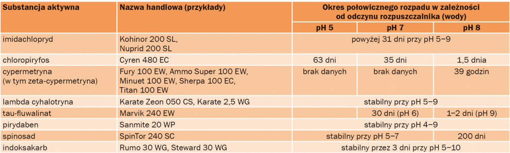 Tabela 1. Czas degradacji wybranych substancji aktywnych insektycydów w zależności od pH rozpuszczalnika (wg m.in. Beard R., Deer H. M., Meszka B.)