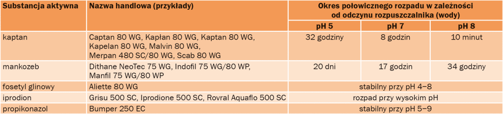 Tabela 2. Czas degradacji wybranych substancji czynnych fungicydów w zależności od pH rozpuszczalnika (wg m.in. Beard R., Deer H. M., Meszka B.)