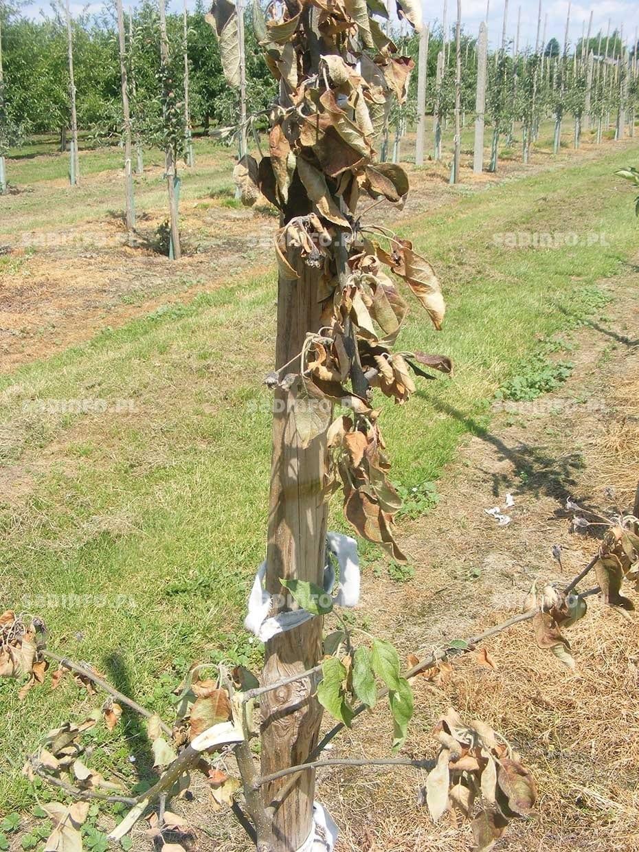 Podczas pracy doradczej wielokrotnie widziałam zamierające na skutek porażenia przez V. dahliae nowo posadzone wiśnie i jabłonie oraz drzewa w pełni owocowania. Przez ostatnie sezony objawy te nasiliły się i częściej dotyczą nowych nasadzeń (fot. 2). Być może wynika to z tego, że sadownicy ze względów ekonomicznych kupują drzewka od przypadkowych osób.