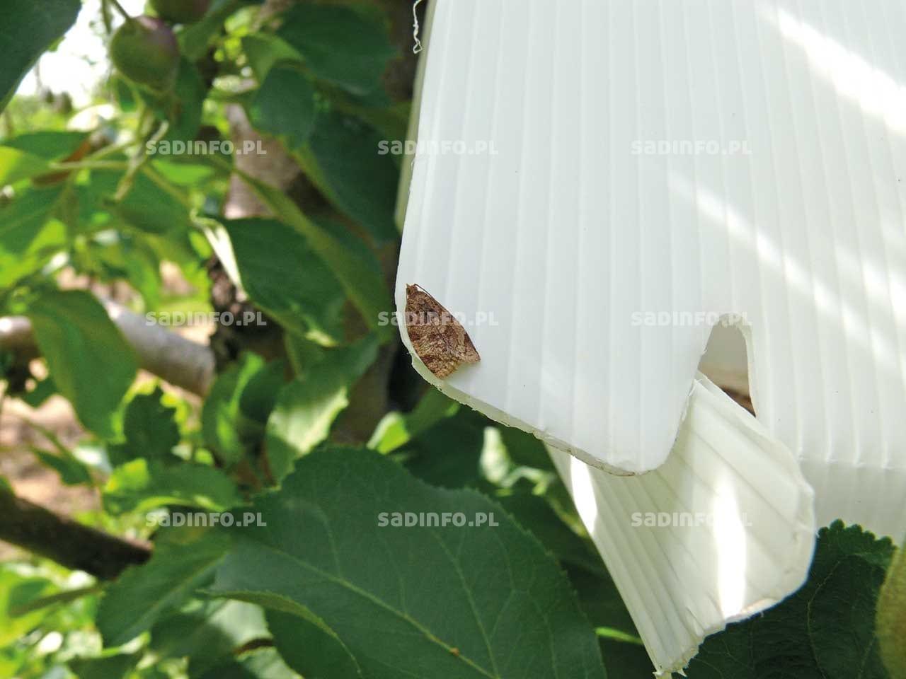 Do stałego zespołu zwójkówek sadów owocowych należą również owocówka jabłkóweczka (fot. 6) i owocówka śliwkóweczka. W sadach prowadzonych racjonalnie i zgodnie ze standardami ochrony integrowanej obowiązującymi od dwóch lat, gatunki te powinny być monitorowane przy użyciu pułapek feromonowych. Pozwalają one nie tylko na określenie stopnia zagrożenia, ale także umożliwiają wyznaczenie odpowiednich terminów wykonania zabiegów takimi preparatami, które mają w zapisie swojej etykiety zalecenie „stosować w okresie intensywnego lotu i masowego składania jaj”, jak również umożliwiają ocenę skuteczności zwalczania. Warto mieć na uwadze, że owocówka jabłkóweczka może również stosunkowo licznie wystąpić w niektórych sadach gruszowych, a owocówka śliwkóweczka – w morelowych i brzoskwiniowych. Zestaw preparatów do zwalczania owocówek jest bardzo podobny do stosowanego przy zwalczaniu zwójkówek liściowych, a szczegóły zamieszczone są w Programach Ochrony Roślin Sadowniczych.