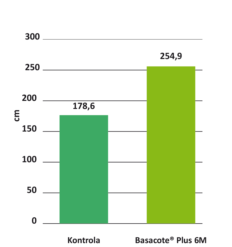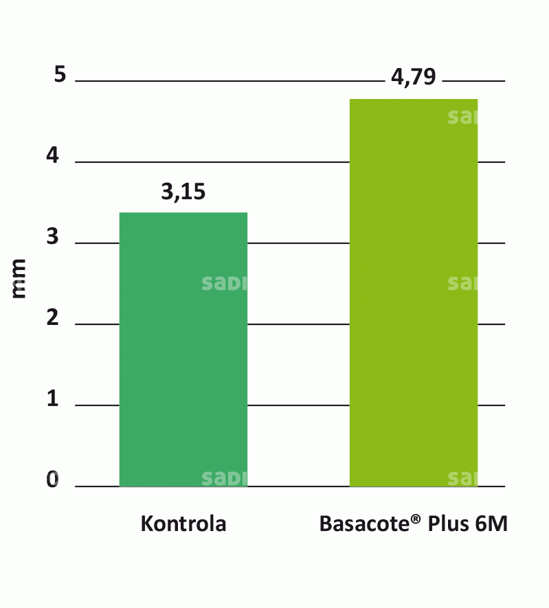 Jesienią 2015 r. oceniano wzrost wegetatywny drzew. Zastosowanie przed sadzeniem nawozu Basacote® Plus 6M w dawce 50 g/drzewko miało istotny wpływ na przyrost średnicy pnia, liczbę oraz sumę przyrostów pędów (rys. 1–3). Po wykopaniu drzewek okazało się, że ich system korzeniowy penetrował granule nawozu (fot. 2) i był zauważanie lepiej rozwinięty w porównaniu z kombinacją kontrolną. Zastosowanie nawozu otoczkowanego było szczególnie widoczne w okresie jesiennym, kiedy rośliny charakteryzowały się lepszym rozwojem części nadziemnej (fot. 3).