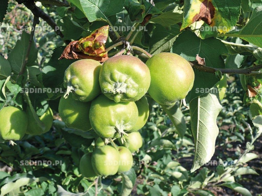 To drugi ważny gatunek mszyc na jabłoniach, występujący zarówno na młodych, jak i starszych (kilkudziesięcioletnich) drzewach (fot. 3). Mszyca ta dla pełnego cyklu rozwojowego potrzebuje drugiego żywiciela, którym są różne gatunki babek. W nieodległej przeszłości, pod koniec maja lub na początku czerwca, następował przelot uskrzydlonych samic na drugiego żywiciela. W ostatnich kilkunastu latach obserwujemy jednak coraz dłuższe żerowanie tej mszycy na jabłoniach. Często jeszcze w sierpniu można spotkać całkiem pokaźne kolonie bytujące ciągle na tych drzewach. Żerowanie osobników tego gatunku powoduje silne kędzierzawienie i zamieranie liści, a w wypadku bliskości zawiązków albo żerowania na nich, prowadzi do zahamowania ich wzrostu i silnej deformacji. Zawiązki takie pozostają małe i nie opadają, a całe grona takich niewyrośniętych i zniekształconych owoców (fot. 4) są dobrze widoczne, szczególnie podczas zbioru. W skrajnych wypadkach, straty w plonie z silnie zasiedlonych drzew sięgać mogą nawet ponad 80%.
