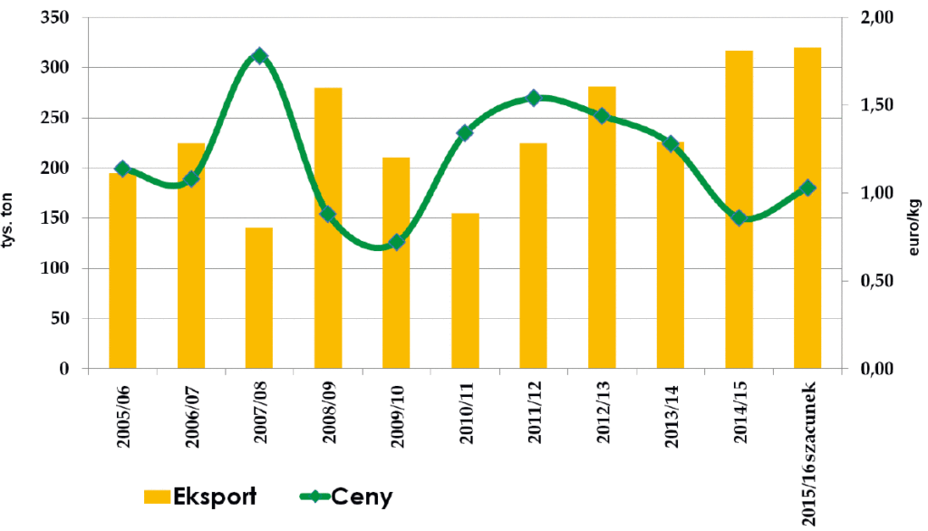 RYSUNEK 2. Eksport zagęszczonego soku jabłkowego z Polski w tys. ton i ceny w eksporcie w euro/kg; za dr B. Nosecką