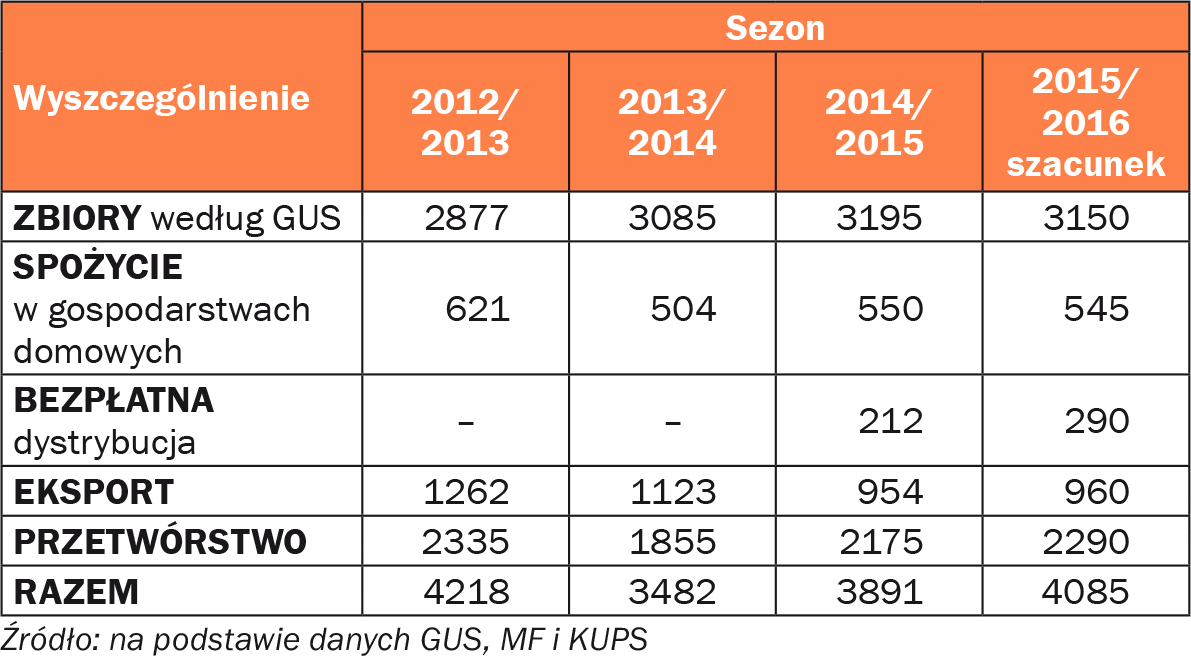 Jak poinformowała dr Bożena Nosecka z Instytutu Ekonomiki Rolnictwa i Gospodarki Żywnościowej (IERiGŻ), w 2015 r. udział jabłek w wartości polskiego eksportu owoców świeżych wyniósł 63,6%. Rozdysponowanie tych owoców w ostatnich latach jest podobne i wynosi: 56% przetwórstwo, 24% eksport i 20% spożycie krajowe (rysunek 1). Niestety, nadal widoczne są znaczne różnice w szacunkach podawanych m.in. przez GUS i IERiGŻ. W sezonie 2015/2016 różnica ta wynosiła niemal milion ton (tabela 1). Sytuacja taka utrudnia funkcjonowanie rynku i racjonalne planowanie produkcji.