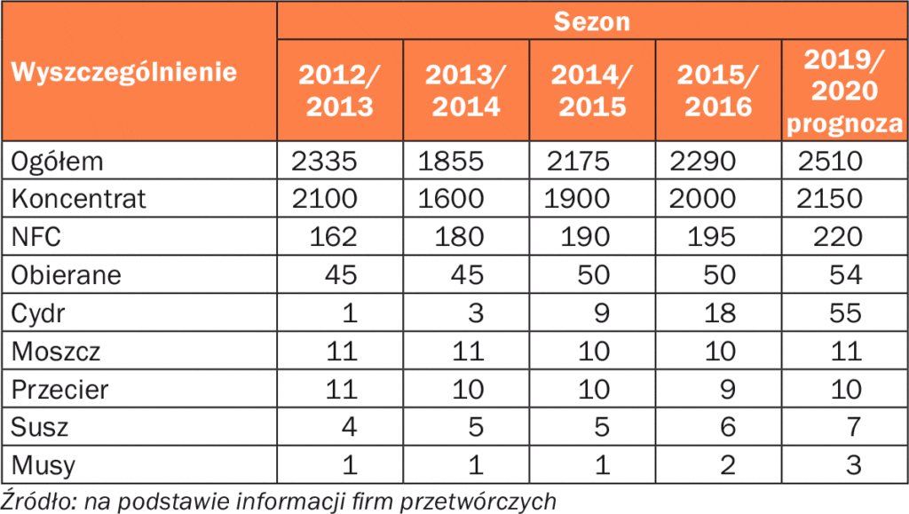 W wypadku przetwórstwa 87–90% jabłek kierowanych do zakładów jest przerabianych na koncentrat. Patrząc na uwarunkowania globalne (np. w Chinach produkcja koncentratu zmniejsza się), należy spodziewać się, że jego produkcja będzie się zwiększała (rys. 2). Warto zwrócić uwagę, że w ostatnich latach dynamicznie wzrosła też produkcja soków NFC oraz cydru (tab. 2).