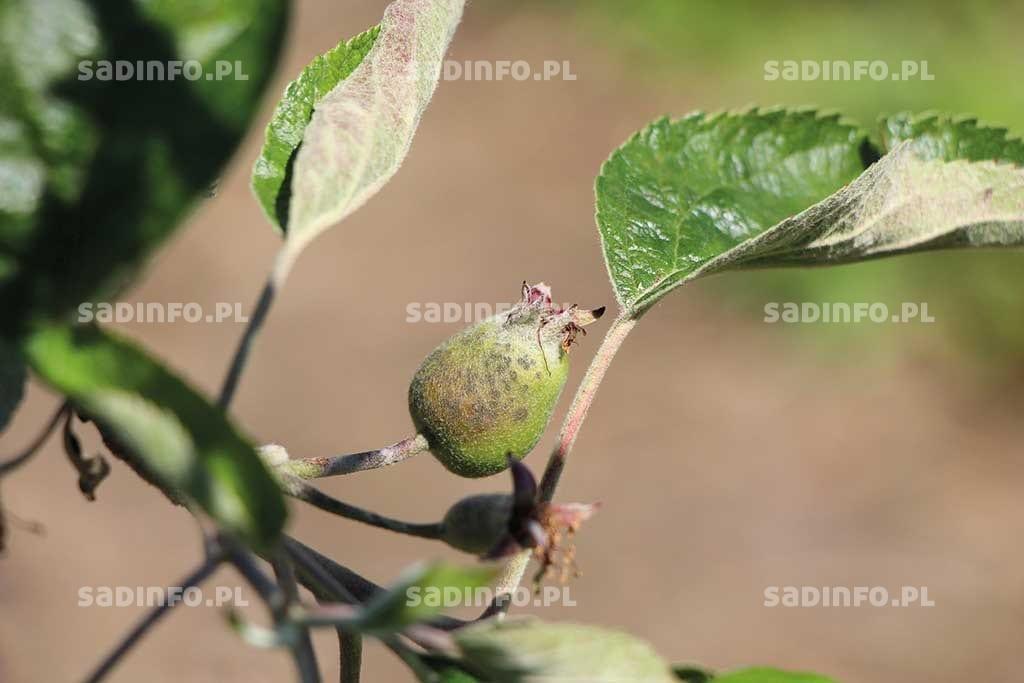 Ponadto, od 15 maja należało koniecznie wykonywać zabiegi na mokry liść fungicydami kontaktowymi (kaptanem, ditianonem, ditiokarbaminianami – kto co miał pod ręką z zapasów przygotowanych na początek sezonu, a niezużytych wówczas), nawet przy zelżeniu intensywności opadu czy podczas mżawki, tzn. utrudniającymi kiełkowanie zarodników workowych (zawsze na zwilżonej powierzchni rośliny), których jeszcze wciąż jest sporo gotowych do wysiewu z kolejnym deszczem. Pamiętać należało, że środki kontaktowe (powierzchniowe) są dość łatwo zmywane przez deszcz z powierzchni rośliny, dlatego też częstotliwość zabiegów musiała być zwiększona. Gdy tylko przestawało padać na kilka godzin, niezwłocznie należało do ochrony włączyć środki interwencyjne – głównie triazolowe czy z grupy SDHI, ale także mieszaniny triazoli z kontaktowymi. Temperatura nie hamowała przenikania środków układowych przez tkanki okrywające (co w efekcie następowało dość szybko, o ile nagły deszcz nie spłukał ich wkrótce po zabiegu) i pozwalała na swobodne intensywne krążenie z sokami docierając do strzępek grzyba V. inaequalis.