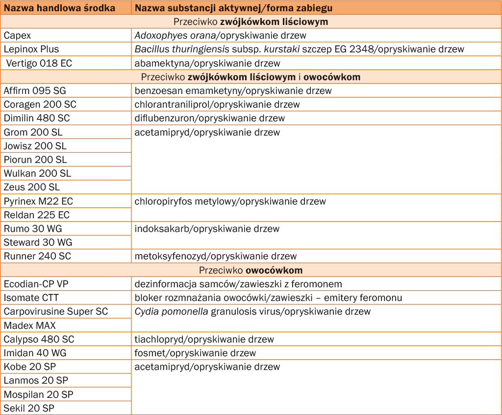 Zoocydy zarejestrowane do zwalczania zwójkówek i owocówek różnymi metodami po kwitnieniu