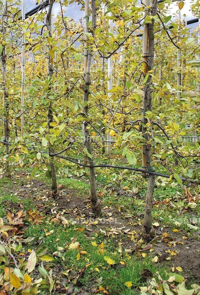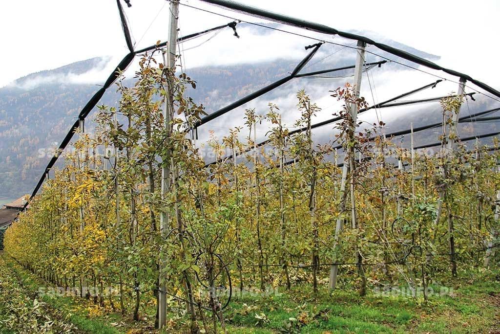 Wśród uprawianych odmian są: ‘Braeburn’ (42%), ‘Gala’ (27%), ‘Scifresh’ (Jazz®; 12%), ‘Cripp’s Pink’ (Pink Lady®; 10%), ‘Golden Delicious’ (9%). Na 70% kwater zamontowane są osłony przeciwgradowe w systemie Wiesel wsparte na palach ze strunobetonu z siatką czarną. W chwili wymiany nasadzeń konstrukcja w kwaterze zostaje, a wymieniane są tylko drzewa w wyznaczonych wcześniej rzędach. Znaną taktyką w Południowym Tyrolu jest wymiana gleby w rzędach drzew – stanowi to wysoki koszt, ale w przypadku stanowisk z oznakami choroby replantacyjnej zabieg jest konieczny dla dalszego powodzenia produkcji i uzyskiwania wysokich plonów. Całość nasadzeń jest nawadniana kroplowo. Linie są prowadzone na wysokości 30–40 cm ponad powierzchnią gruntu (fot. 4), aby możliwa była mechaniczna walka z chwastami za pomocą kosiarki z czujnikiem (nie uszkadza pni drzew, kosi chwasty także między drzewami). W sadzie zamontowane jest nawadnianie nadkoronowe, ale nie jest wykorzystywane do ochrony przed wiosennym przymrozkiem ze względu na niedostateczną dostępność wody.