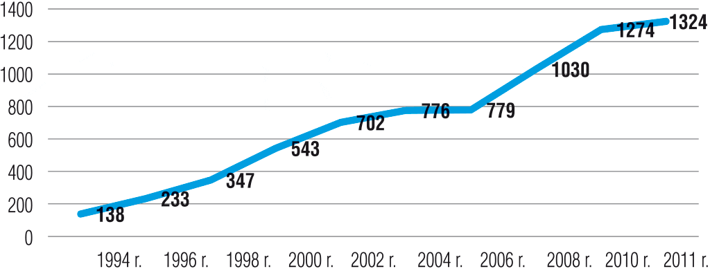 Zmiany w powierzchni sadów z ekologiczną produkcją jabłek w Południowym Tyrolu (w ha)