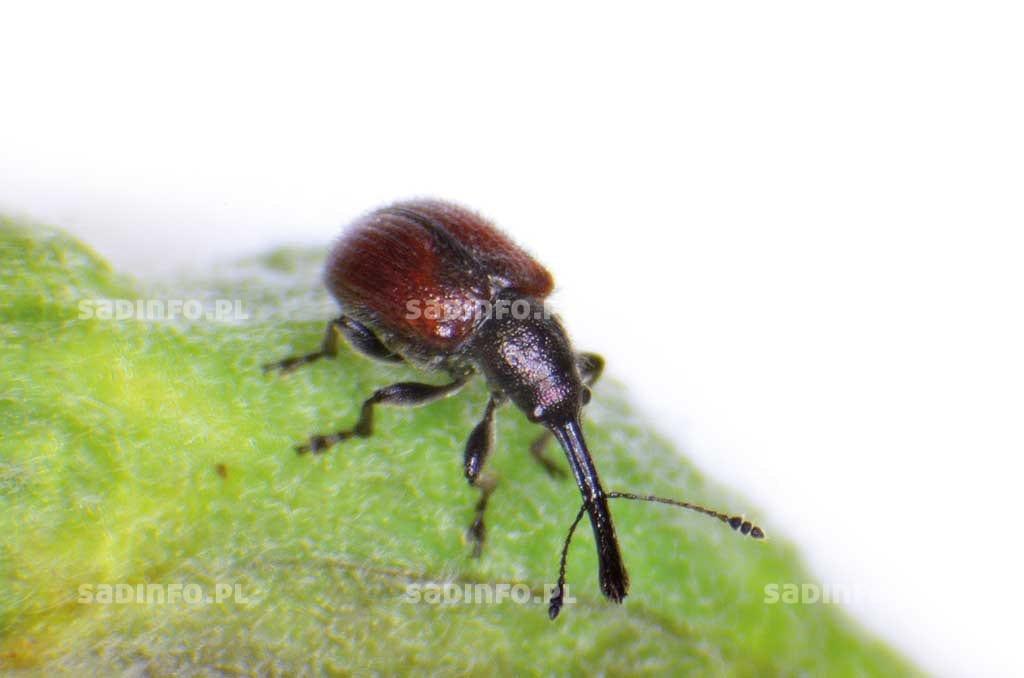W lustrowanych przez nas sadach jabłoniowych i wiśniowych najczęściej występowały chrząszcze tutkarza bachuska (Rhynchites bacchus), które mają długość 4,5–6,5 mm i barwę purpurowo-czerwoną (fot. 1). Owady uszkadzają liście, pąki kwiatowe i kwiaty, na skutek czego ulegają one deformacji. Ponadto chrząszcze nakłuwają zawiązki owoców, pozostawiając niewielkie, okrągłe jamki o średnicy około 2 mm. Jest to przyczyną deformacji, powstawania tkanki korkowej na powierzchni owocu, obniżenia jego wartości handlowej, a przy silnym uszkodzeniu nawet opadania zawiązków. Dodatkowo miejsca uszkodzenia owoców przez tutkarze często są infekowane przez grzyby z rodzaju Monilinia spp., które wywołują brunatną zgniliznę owoców drzew ziarnkowych. W sadach jabłoniowych spotykane były także chrząszcze tutkarza ogonkowca (Neocoenorrhinus pauxillus), długości 2,0–3,0 mm, barwy ciemnoniebieskiej lub niebieskozielonej. Chrząszcze tego gatunku niszczą pąki, kwiaty oraz wygryzają tkankę liści. Rozwijające się larwy minują liście, pozostawiając w nich puste korytarze. Uszkodzone liście brązowieją i opadają.