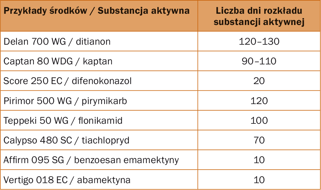 Ważne jest, by stosować się do zasad integrowanej ochrony nie tylko w dokumentacji, ale przede wszystkim w praktyce. Już od początku sezonu należy dobrze przemyśleć strategię ochrony. Jeśli w porę odpowiednio zareagujemy, to mniejsze jest ryzyko wystąpienia danego problemu w trakcie sezonu. Im wcześniej zostanie zastosowany dany środek, tym więcej jest czasu na rozkład substancji aktywnej. Ważne też jest, aby wybierać preparaty selektywne, które nie mają negatywnego działania na owady pożyteczne. Jeżeli sadownik chce uzyskać jabłka zawierające nie więcej niż 4 pozostałości substancji aktywnych, po kwitnieniu nie powinien stosować preparatów zawierających: ditianon, fosforyny, ditiokarbaminiany i pirymikarb, ponieważ zostaną one wykryte. Przed sezonem warto przeanalizować, które 3 substancje aktywne są niezbędne do ochrony naszego sadu, a jedną substancję zostawić jako alternatywę, w zależności od przebiegu sezonu. Sadownik, który rzetelnie prowadził integrowaną produkcję w swoim sadzie, niewiele będzie musiał zmienić, by przejść na program 4 pozostałości. Należy założyć, że w pozostałościach zostanie substancja aktywna ze środka stosowanego na trwałość pozbiorczą (jedna lub dwie w przypadku preparatu Bellis 38 WG), kaptan oraz zazwyczaj jedna substancja wybranego insektycydu. Fosforyny mogą być wykryte również, gdy są stosowane przed kwitnieniem, ale zazwyczaj nie są. Głównie na rynku niemieckim wymagane są jabłka bez pozostałości tego związku, nawet gdy jego zawartość mieści się w normach. Bardzo szybko rozkładającymi się substancjami aktywnymi znajdującymi się środkach owadobójczych są: abamektyna – 10 dni (Vertigo 018 EC) oraz benzoesan emamektyny – 10 dni rozkładu (np. Affirm 095 SG). Bez ograniczeń, ze względu na brak pozostałości, można stosować: kwaśny węglan potasu, preparaty wirusowe, feromony przeciwko owocówce i zwójkom, oleje, 6-BA oraz laminarynę (tabela).