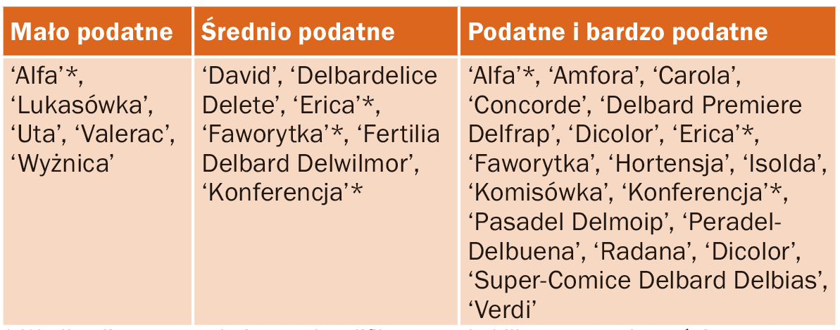 * Według literatury odmiany zakwalifikowane do kilku grup podatnościTabela 3.