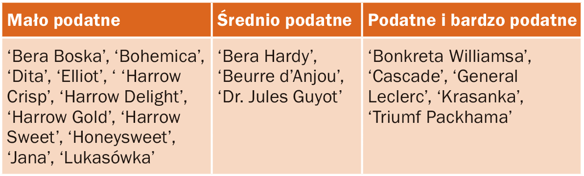 Podatność odmian gruszy na zarazę ogniową wg literatury