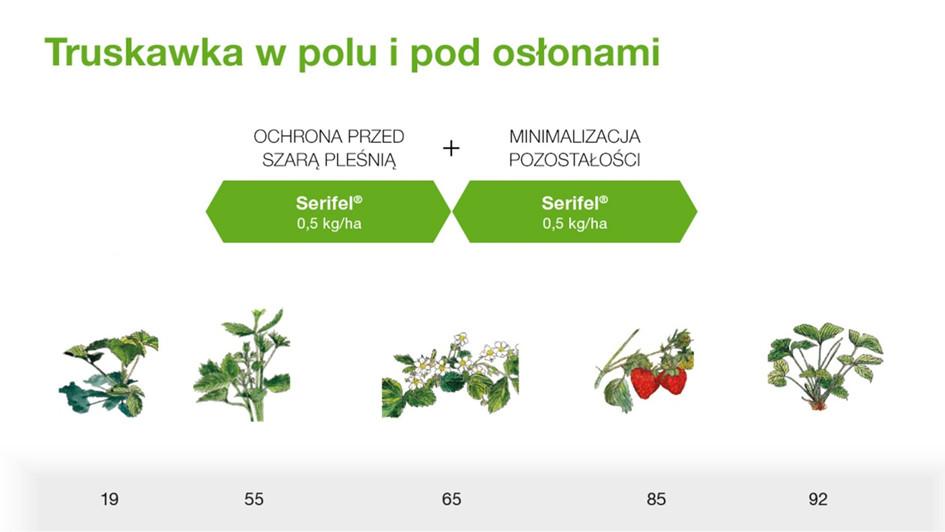 Pamiętajmy jednak, że podobnie jak w przypadku każdego innego rozwiązania ważna jest profilaktyka. Serifel® należy stosować zapobiegawczo, jeszcze przed wystąpieniem objawów choroby. Preparat bardzo dobrze chroni rośliny przed infekcją najczęściej występujących patogenów grzybowych, takich jak szara pleśń (Botrytis cinerea) czy zgnilizna twardzikowa (Sclerotinia sclerotiorum). Serifel® w uprawie roślin jagodowych można stosować do 6 razy w sezonie, od początku fazy rozwoju kwiatostanu do drugiego zbioru (zbiór późny) lub początku fazy opadania owoców (BBCH 55-89).