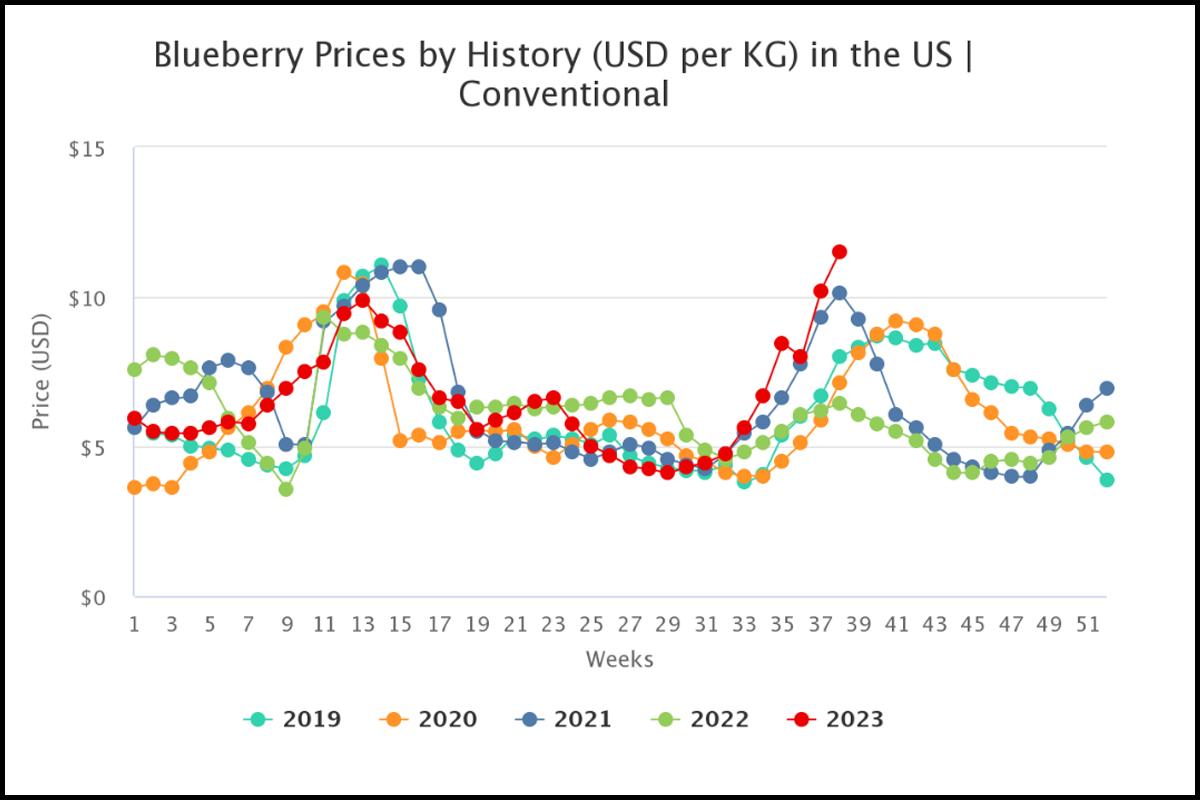 Na załączonym wykresie wyraźnie widać jak tegoroczne stawki (czerwona linia z punktami) wyróżniają się od poprzednich sezonów. Od początku miesiąca importerzy w USA płacą za peruwiańskie borówki ponad 46 zł/kg (11 usd/kg). W Europie ceny są nieco wyższe. Aktualnie na rynku hurtowym w Broniszach kilogram importowanych jagód kosztuje 75,00 - 80,00 zł. Opisywana sytuacja utrzyma się w USA, a także w Europie i w Polsce co najmniej do końca października.