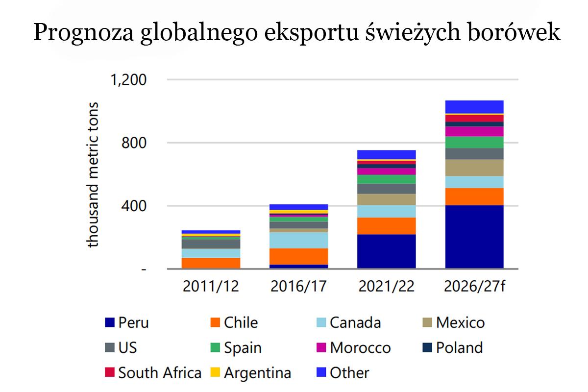 Eksport świeżych owoców jagodowych na światowym rynku ponownie wzrósł w 2022 roku. Największy wzrost notowany jest w przypadku borówek. Będzie on kontynuowany w nadchodzących latach. Jak widzimy na wykresie niżej, coraz większe wolumeny będą pochodzić przede wszystkim z Peru, Meksyku i Maroko. Prognozowany jest także wzrost eksportu z Polski.