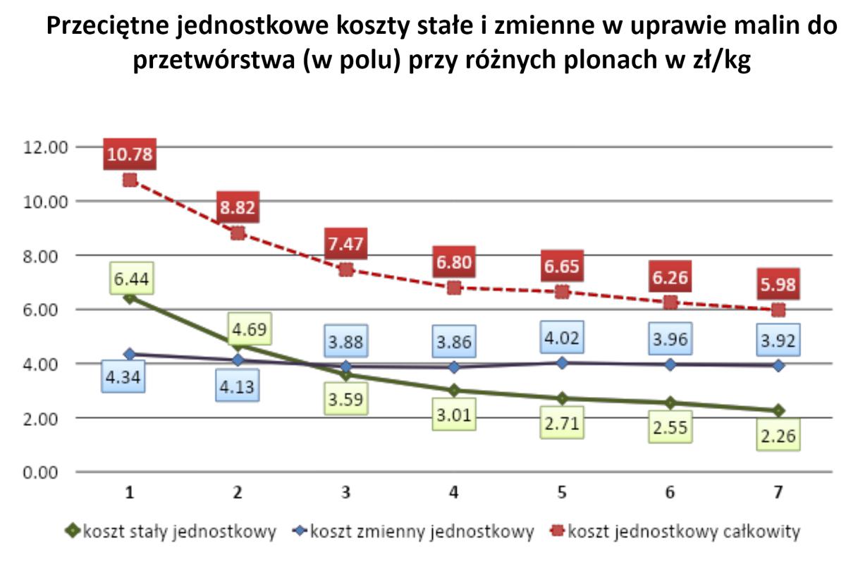 Naukowiec przeliczył dane na przykładzie plonowania malin do przetwórstwa od 4 do 16 ton z hektara. Jak podkreślał, najszybszy spadek kosztów jednostkowych zauważamy przy wzroście wydajności z 4 do 8 lub 10 ton z hektara. Wówczas koszt wyprodukowania kilograma malin spada z 10,78 do 6,80 zł/kg.