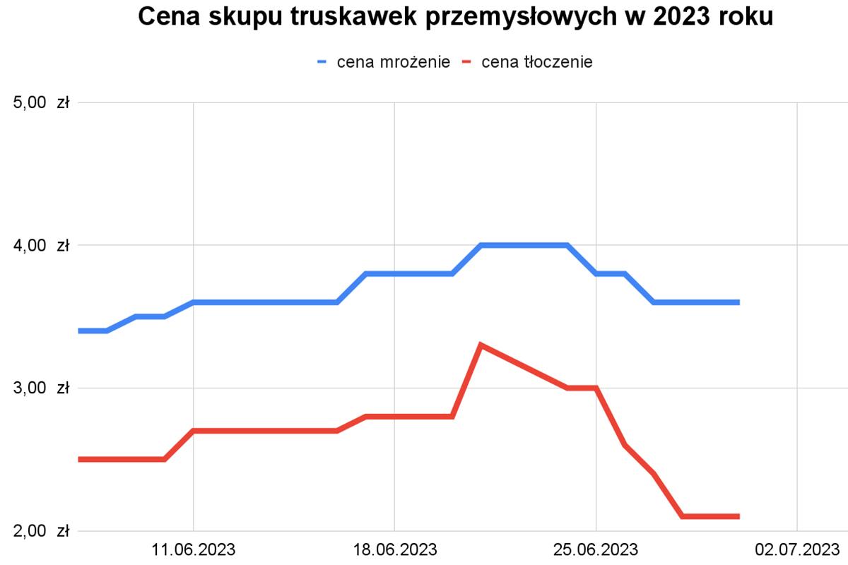 Jeśli chodzi o truskawki na tłoczenie to sytuacja była jeszcze gorsza. Po 25 czerwca, cena na punktach skupu spadła do poziomu 2,00 - 2,20 zł/kg. Trudno skomentować te stawki inaczej, niż badanie przez ich właścicieli tego, po jak niskich cenach plantatorzy są w stanie dostarczyć surowiec. Tani syrop/koncentrat truskawkowy nie „zalał” naszego rynku. Opady deszczu były więc doskonałym argumentem do obniżek i tak niskich już stawek...