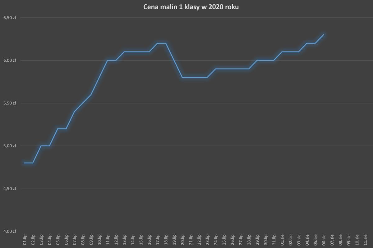 Jeśli chodzi o ceny, to ten sezon zdecydowanie charakteryzował się stosunkowo stabilnym przebiegiem ceny w czasie. Zarówno w przypadku malin pierwszej klasy, jak również tych z przeznaczeniem do tłoczenia. W przypadku malin pierwszej kasy możemy zauważyć stały trend wzrostowy. W środku sezonu wystąpiła tylko jedna korekta cenowa, która zawsze towarzyszy trendom wzrostowym. Średnia cena skupu pierwszej klasy malin w tym roku wyniosła około 5,80 zł za kilogram. W przypadku malin na tłoczenie było to około 5,10 zł za kilogram.
