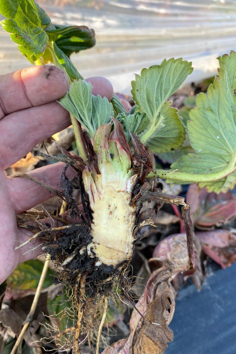 Aby prawidłowo zdiagnozować stopień uszkodzeń mrozowych na posiadanej plantacji należy losowo wytypować kilka-kilkanaście najsłabszych sadzonek z określonej odmiany i wykonać przekrój wzdłużny przez szyjkę korzeniową (przekrój poprzeczny może nie dać odpowiednich informacji fot.7). Na stronie doradcajagodowy.pl zamieszczono 5-stopniową skalę uszkodzeń mrozowych oraz informację o potencjalnym spadku plonu w skrajnie niekorzystnych warunkach utrudniających regenerację. Wszystkie kolejne zabiegi stymulujące regenerację tych uszkodzeń powinny być dopasowane do ich intensywności.